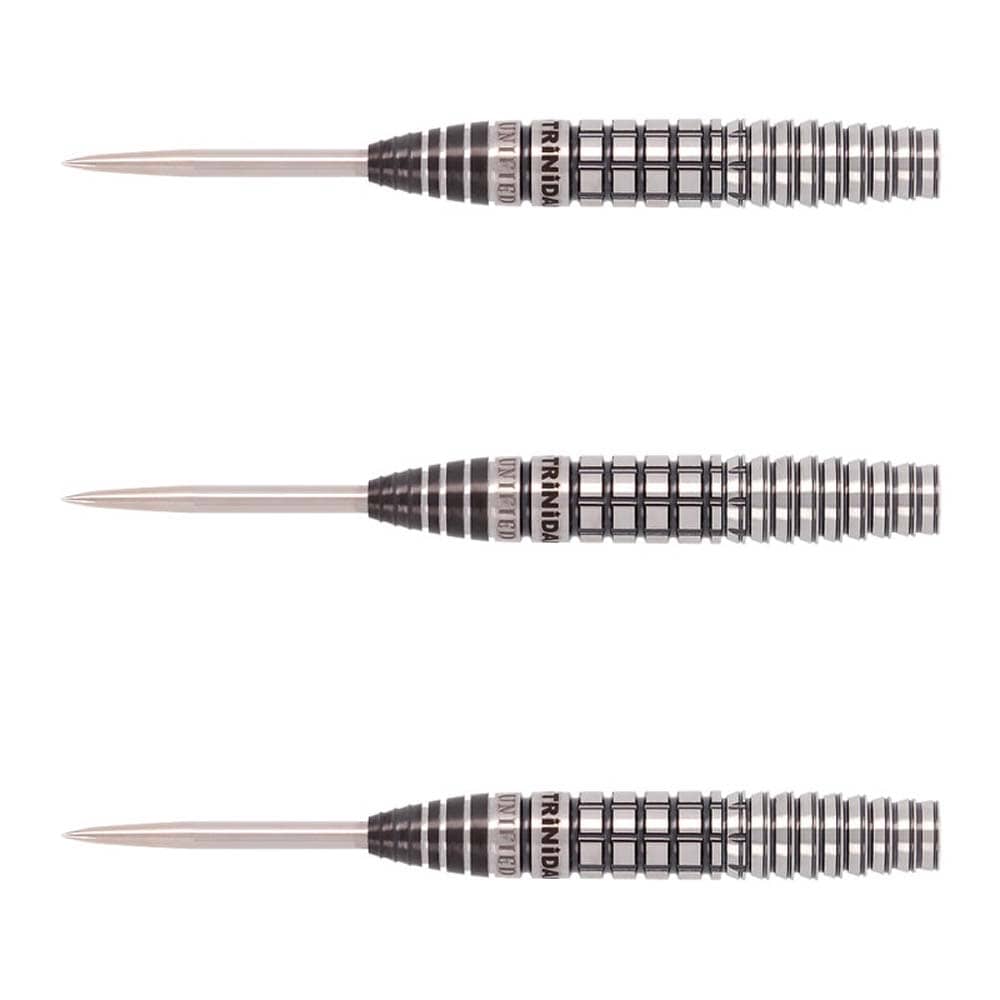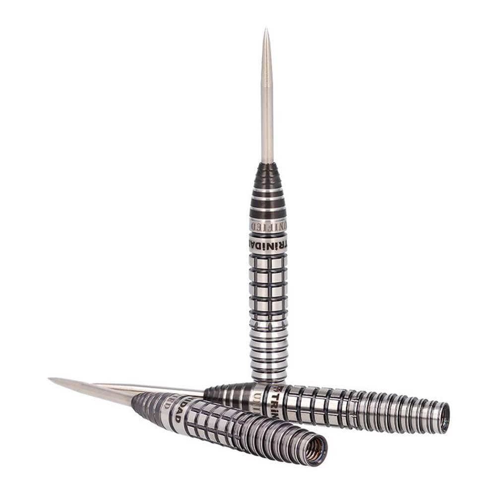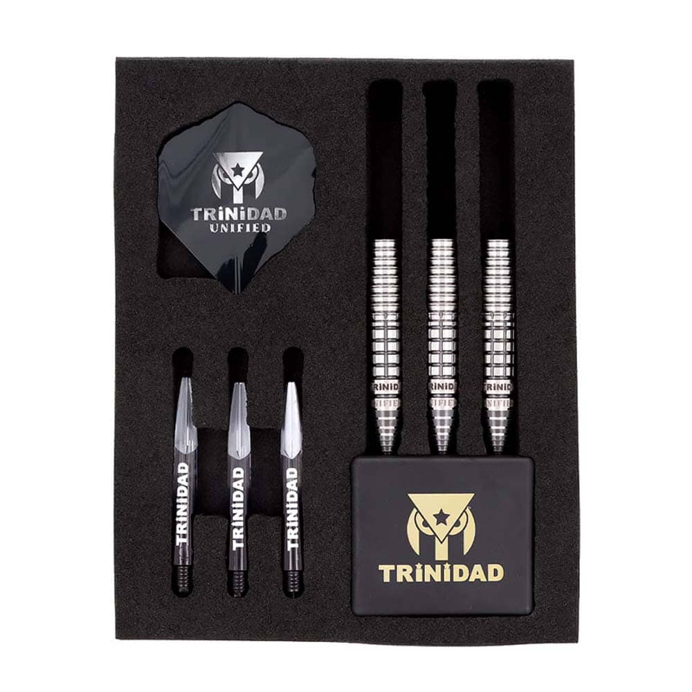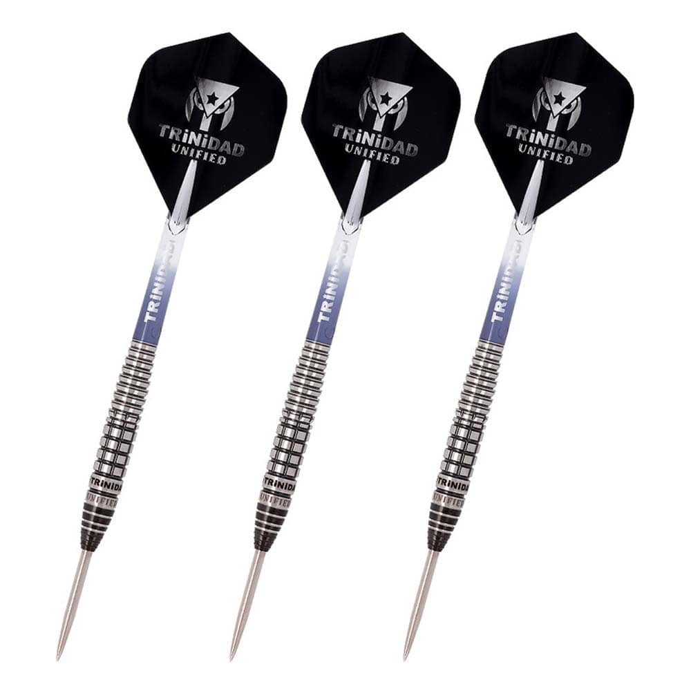 El juego de dardos se compone por 1 set de 3 cuerpos Gonzalez Type6 con punta de acero, 1 set de 3 plumas Trinidad y 1 set de 3 cañas Trinidad.
