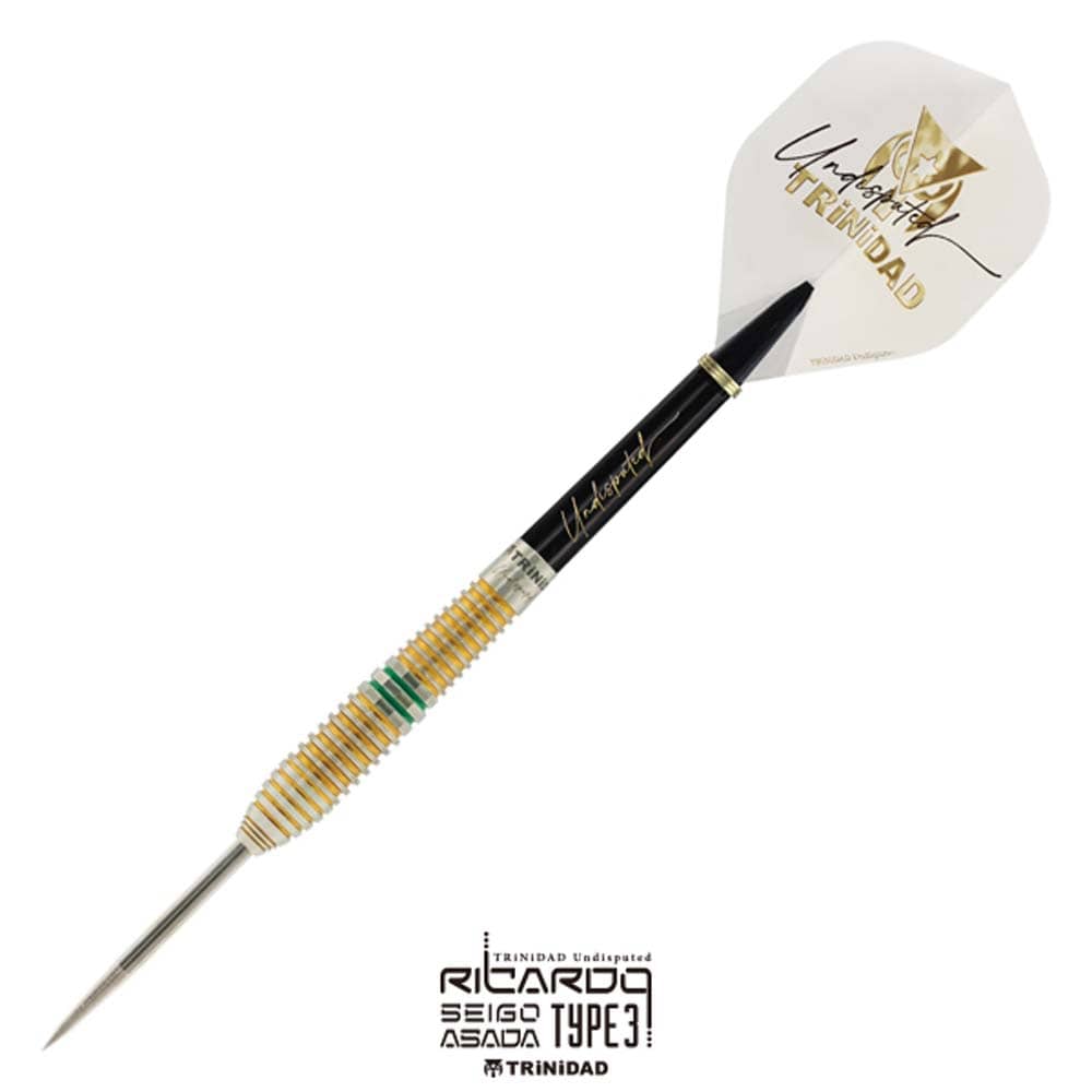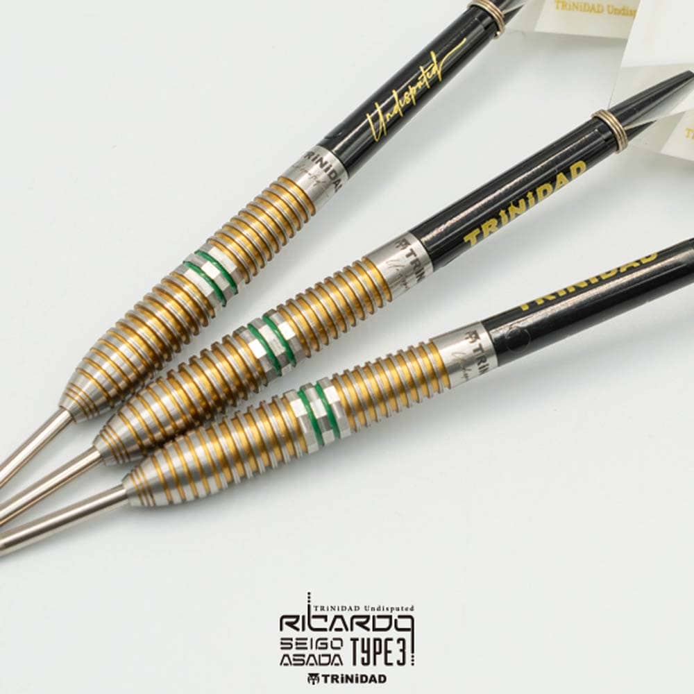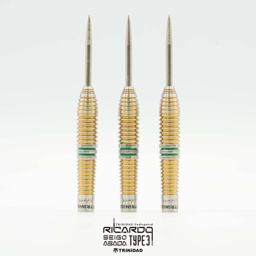 El juego de dardos Trinidad Ricardo Type 3 se compone por 1 set de 3 cuerpos con punta de metal, 1 set de 3 plumas Trinidad y 1 set de cañas Trinidad.
