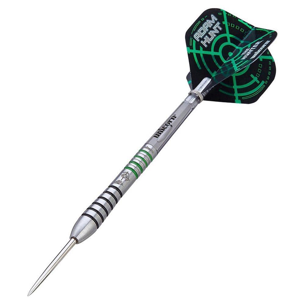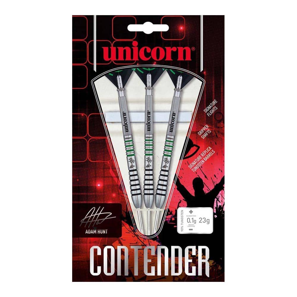 El juego de dardos Unicorn Contender Adam Hunt se compone por 1 set de 3 cuerpos con punta de metal, 1 set de 3 cañas Unicorn medium y 1 set de 3 plumas Ultrafly Unicorn.