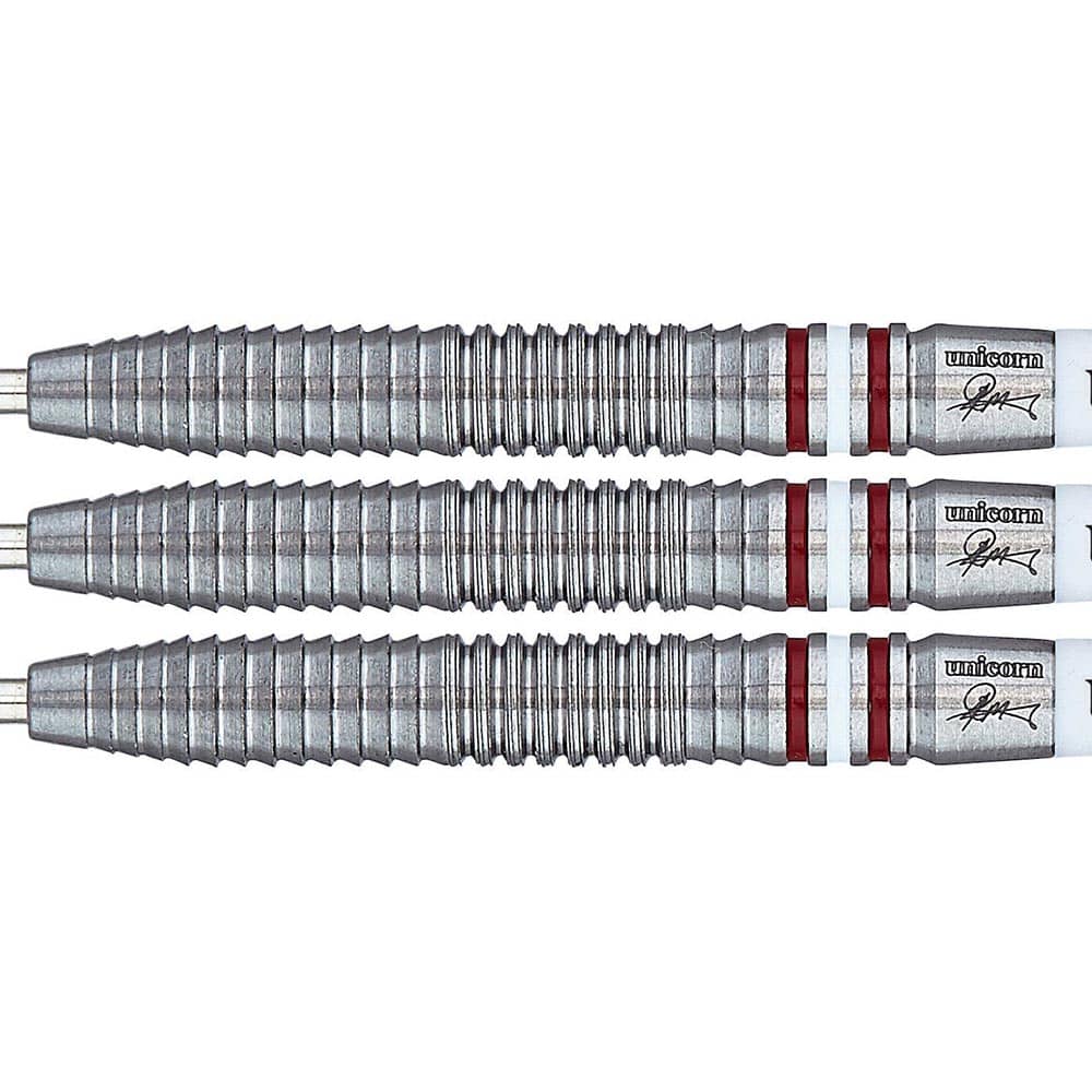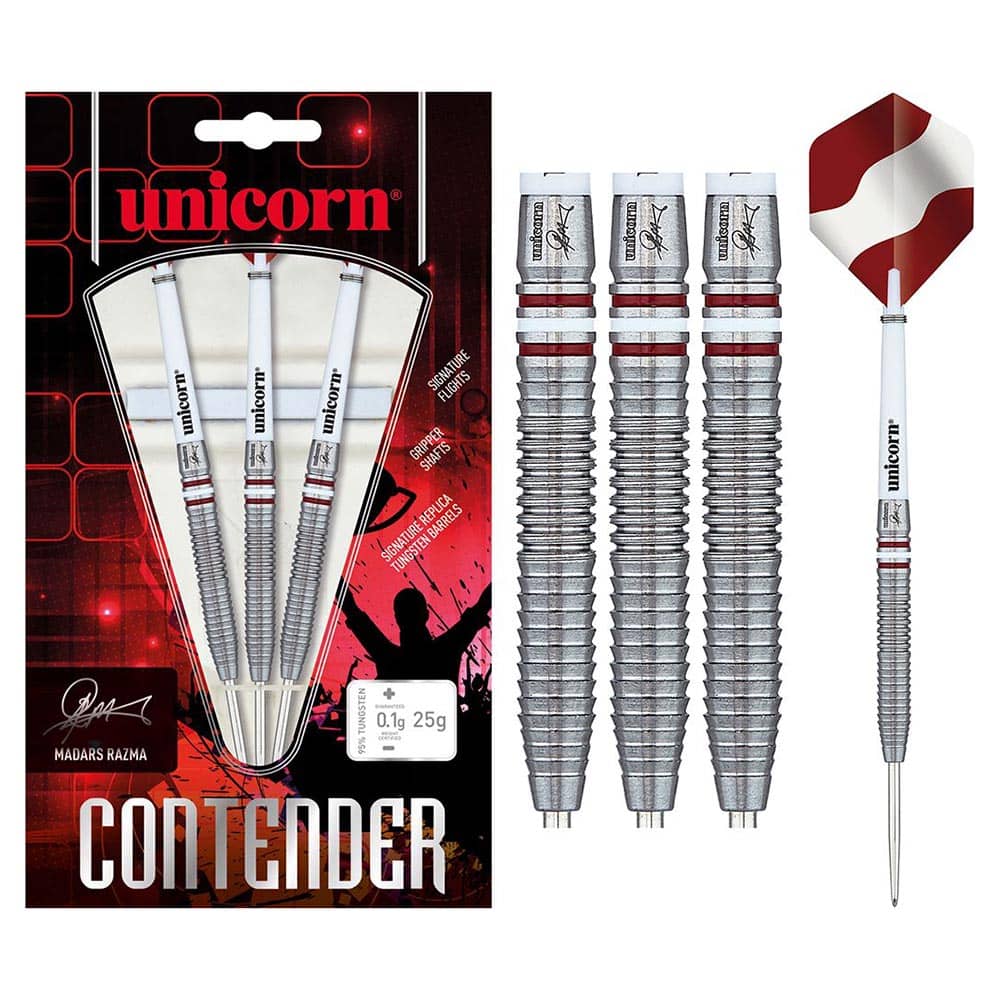 El juego de dardos Unicorn Contender Madars Razma se compone por 1 set de 3 cuerpos con punta de metal, 1 set de 3 cañas Unicorn medium y 1 set de 3 plumas Unicorn.