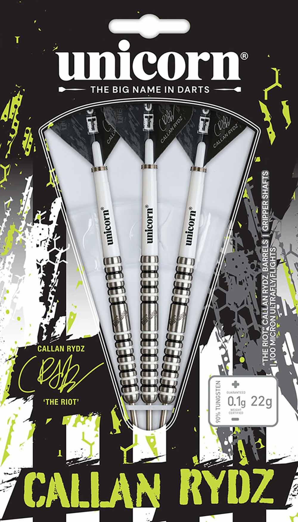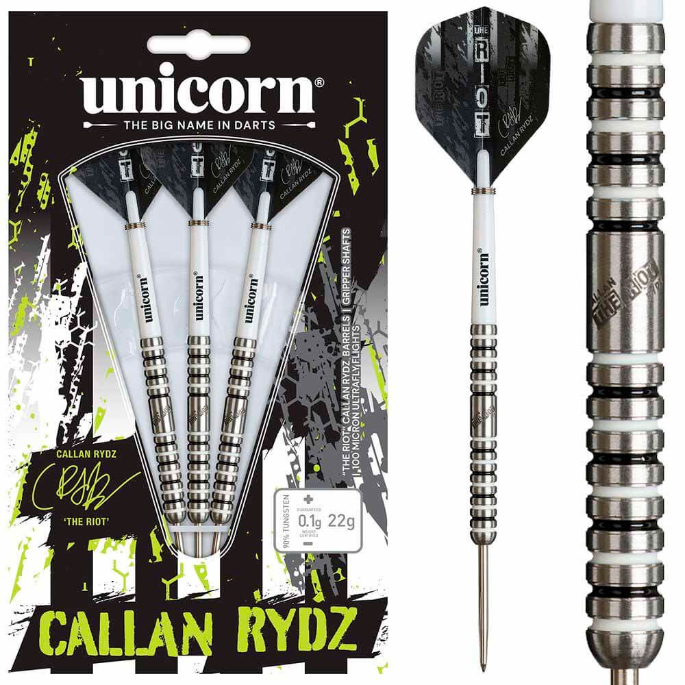 Los dardos Callan Rydz Phase 2 tienen barriles de tungsteno al 90%, con el icónico logo "The Riot" y rayas blancas y negras como su bandera de su ciudad natal, Newcastle. Los barriles se complementan con las cañas Gripper 4 White, la nueva pluma Ultrafly de Callan y las puntas Volute patentadas de Unicorn, que proporcionan un agarre increíble en la diana sin dañarla.
