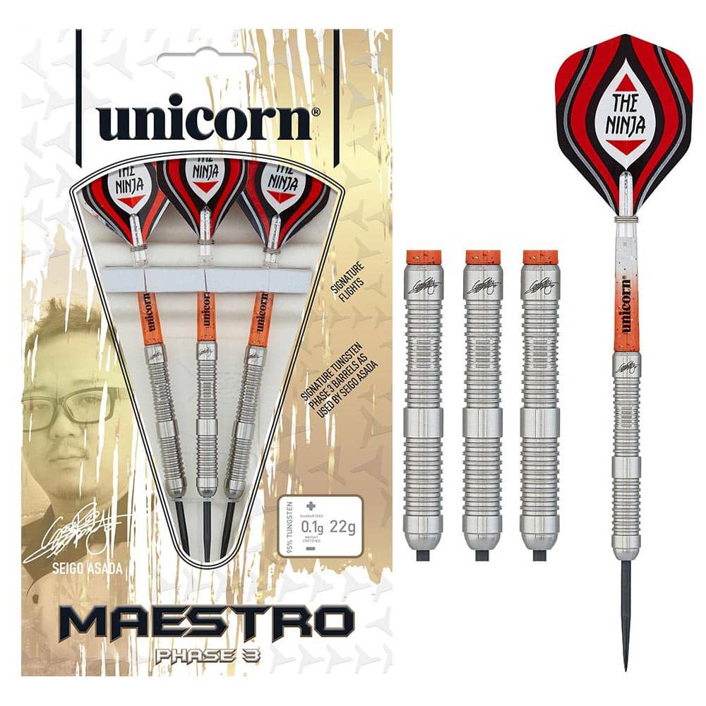 DESCRIPCIÓN:Dardos de gran calidad fabricados por la marca de dardos Unicorn Darts y diseñados por el jugador Unicorn Seigo Asada ahora en su versión Phase 3, esta versión lo que mas resalta de este modelo de dardos es que tiene un ligero rebaje en la zona de agarre trasera donde los dedos se adaptan a la perfección.