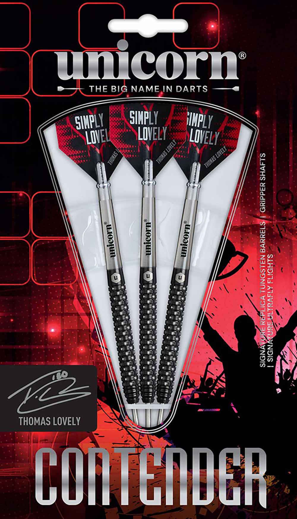El juego de dardos Unicorn Thomas Lovely se compone por 1 set de 3 cuerpos con punta de metal, 1 set de 3 cañas Unicorn y 1 set de 3 plumas