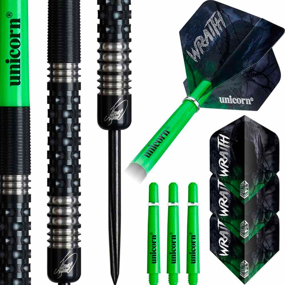 El juego de dardos Unicorn Wraith James Wade Phase 2 se compone por 1 set de 3 cuerpos con punta de metal, 1 set de 3 cañas Unicorn y 1 set de 3 plumas