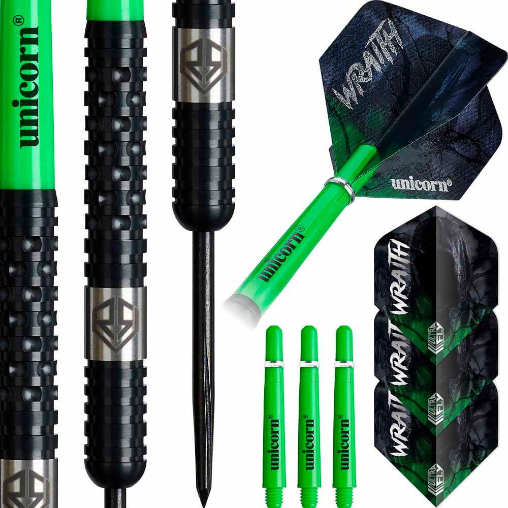 El juego de dardos Unicorn Wraith Ross Smith se compone por 1 set de 3 cuerpos con punta de metal, 1 set de 3 cañas Unicorn y 1 set de 3 plumas