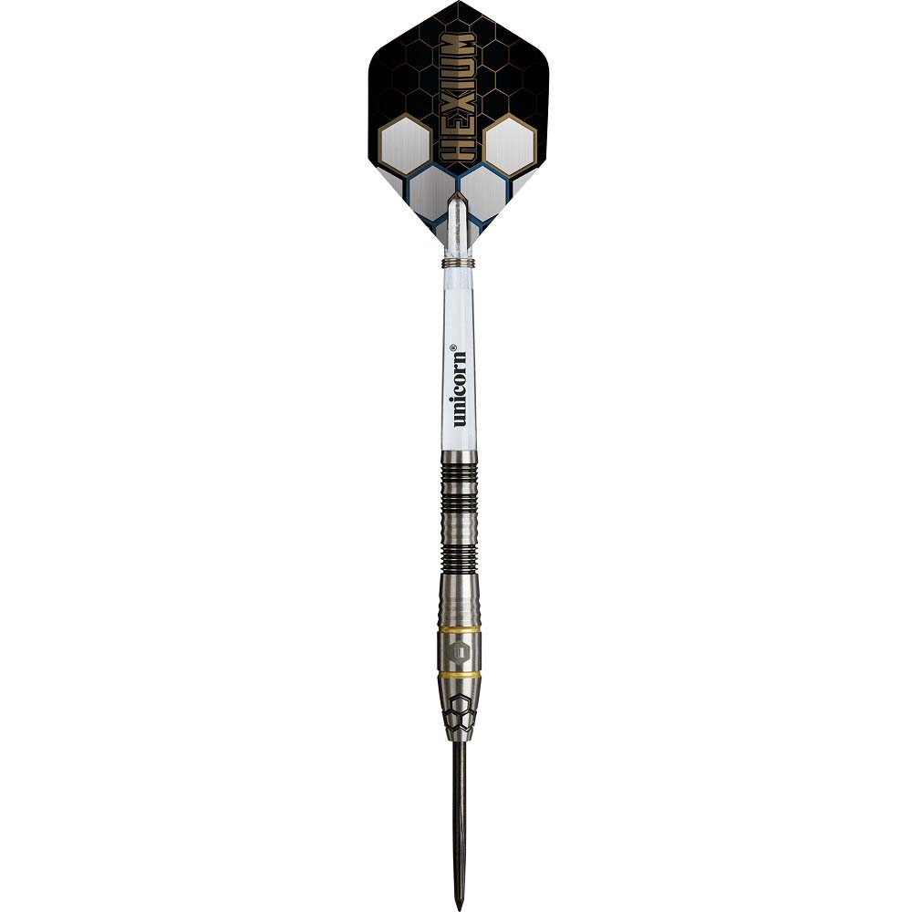 El juego de dardos Unicorn Hexium 1 Black Gold se compone por 1 set de 3 cuerpos, 1 set de 3 cañas Unicorn y 1 set de 3 plumas Unicorn