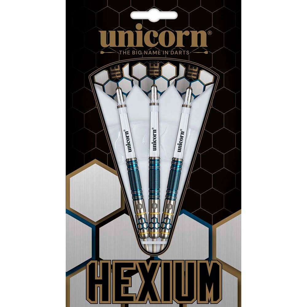 El juego de dardos Unicorn Hexium 2 Blue Gold se compone por 1 set de 3 cuerpos, 1 set de 3 cañas Unicorn y 1 set de 3 plumas Unicorn