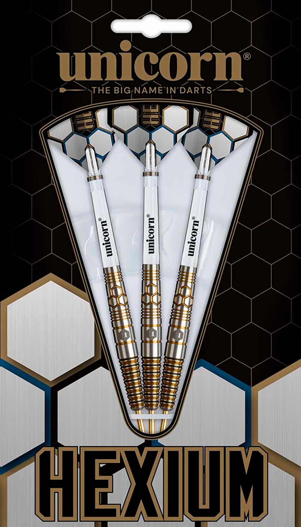 El juego de dardos Unicorn Hexium 3 Black Gold se compone por 1 set de 3 cuerpos, 1 set de 3 cañas Unicorn y 1 set de 3 plumas Unicorn
