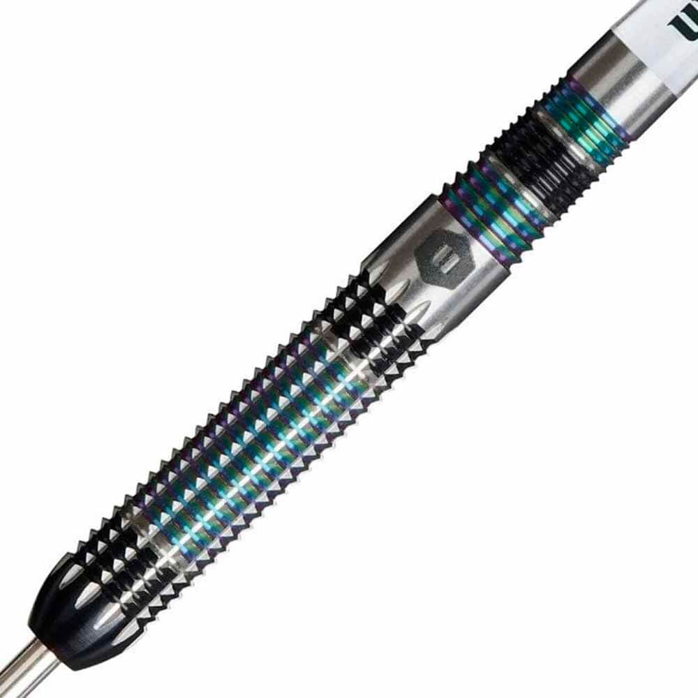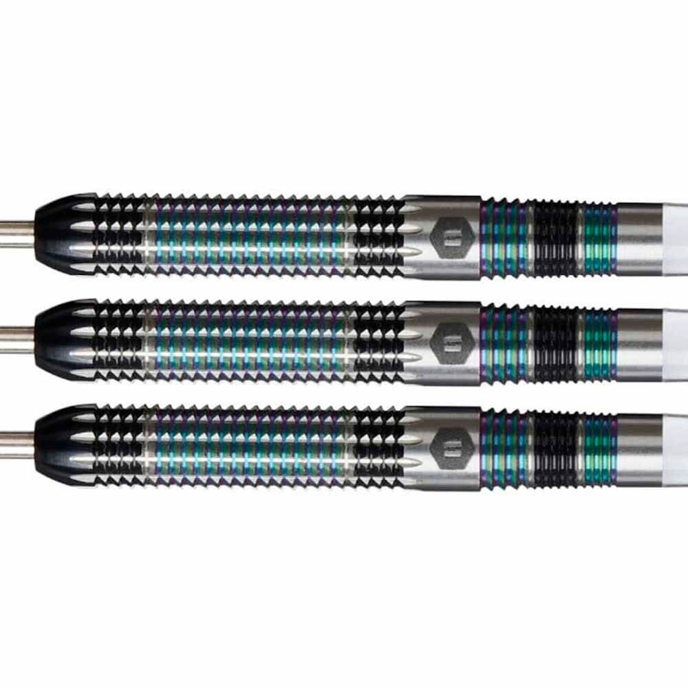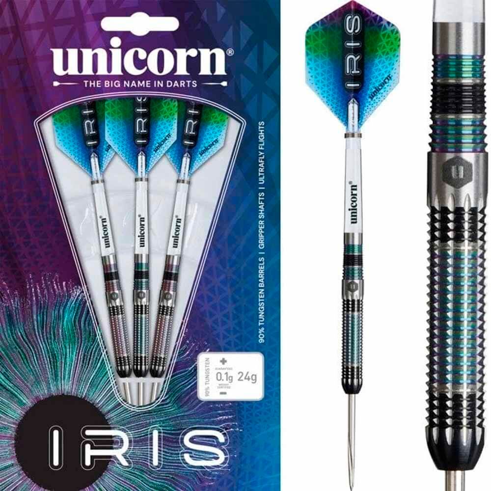 El juego de dardos se compone por: 1 set de 3 cuerpos Unicorn Iris 90%, 1 set de 3 cañas Unicorn Darts, 1 set de 3 plumas modelo Iris.