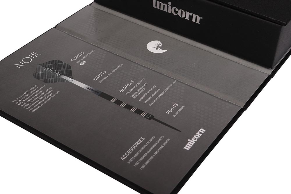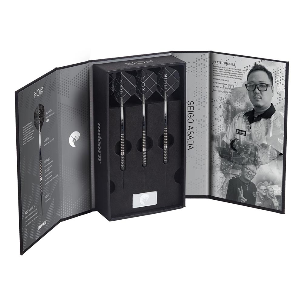 DESCRIPCIÓN:Dardo de gran calidad diseñado por el jugador Seigo Asada mas conocido en el mundo de dardos como The Ninja, dardos un agarre anillado con zona central lisa con logo unicorn. El acabado anilla a sido marcado en la zona mas cercana a la punta para mejorar su agarre y tacto.Dardos acabado en color negro con zonas en tungsteno natural.