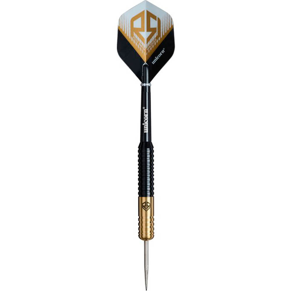 El juego de dardos Unicorn Ross Smith Brass se compone por 1 set de 3 cuerpos con punta de metal, 1 set de 3 cañas Unicorn y 1 set de 3 plumas Unicorn