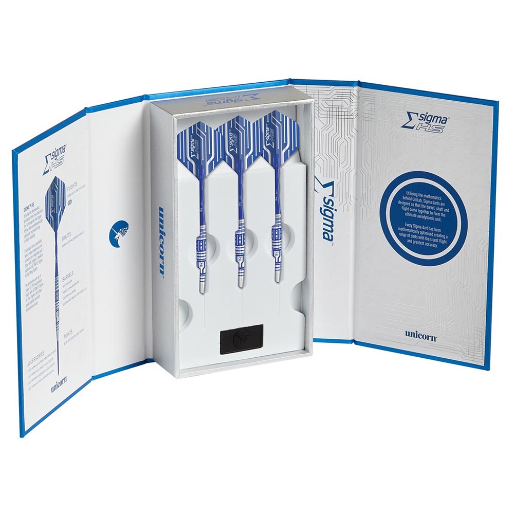 El juego de dardos se compone por 1 set de 3 cuerpos Unicorn Sigma HS, 3 Sets Sigma HS ULTRAFLY Big Wing Flights , 1 Set Sigma HS ULTRAFLY Plus Flights, 1 Set Gripper 4 Elements Clear Shafts, 1 Set Sigma HS 7075 Aluminium Shafts.