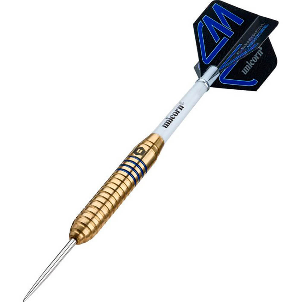 El juego de dardos Unicorn Wraith Cameron Menzies Brass se compone por 1 set de 3 cuerpos con punta de metal, 1 set de 3 cañas Unicorn y 1 set de 3 plumas Unicorn