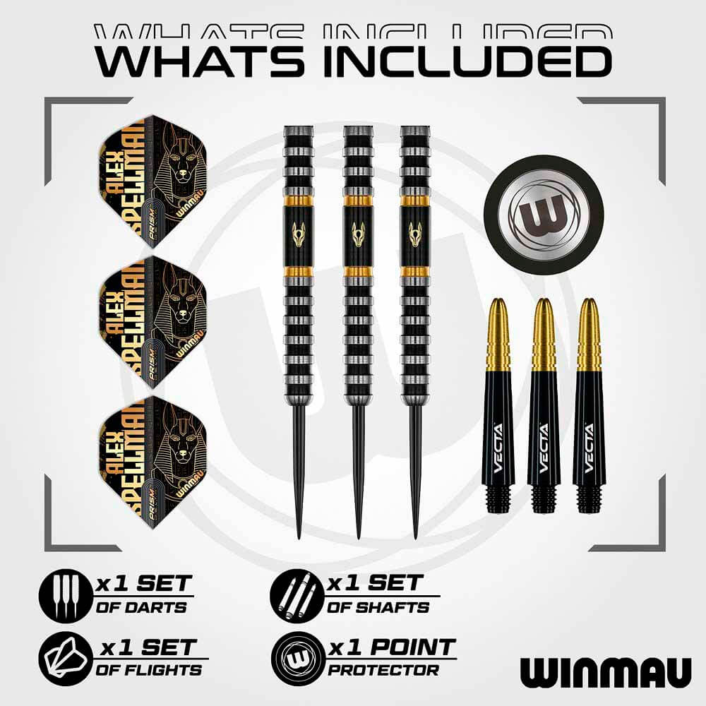 El juego de dardos Winmau Alex Spellman se compone por 1 set de 3 cuerpos con punta de metal, 1 set de 3 cañas y 1 set de 3 plumas.