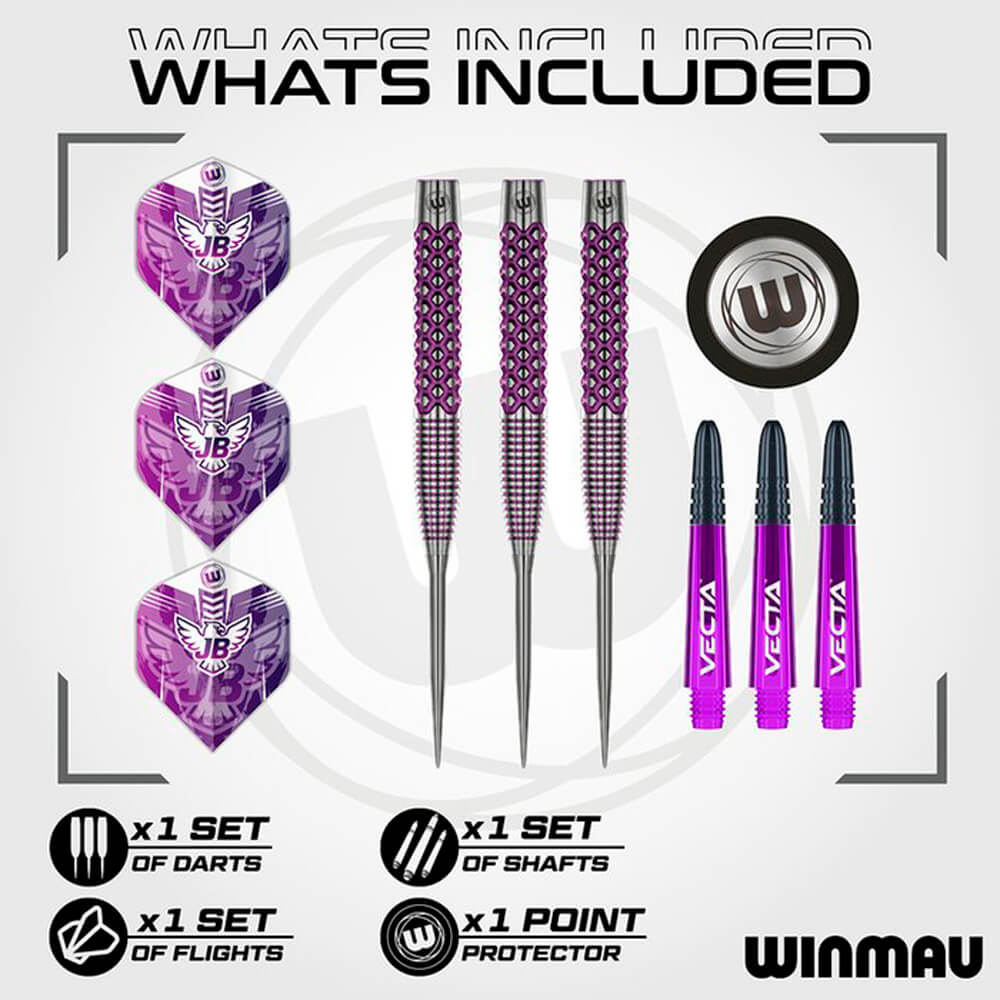 El producto se compone de por 1 set de 3 cuerposJohn Brown de la marca Winmau Darts, 1 set de 3 cañas Winmau Vecta , 1 set de plumas Winmau.