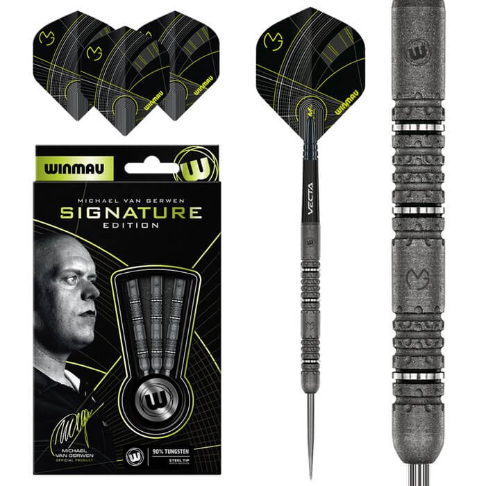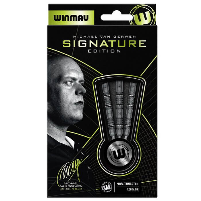 DESCRIPCIÓN:Los Winmau Michael van Gerwen Signature Edition son dardos de alto rendimiento diseñados para jugadores que buscan máxima precisión, control y equilibrio. Fabricados con 90% de tungsteno, ofrecen un barril delgado y compacto que permite agrupaciones más cerradas y lanzamientos más exactos, inspirados en el estilo del campeón mundial Michael van Gerwen.