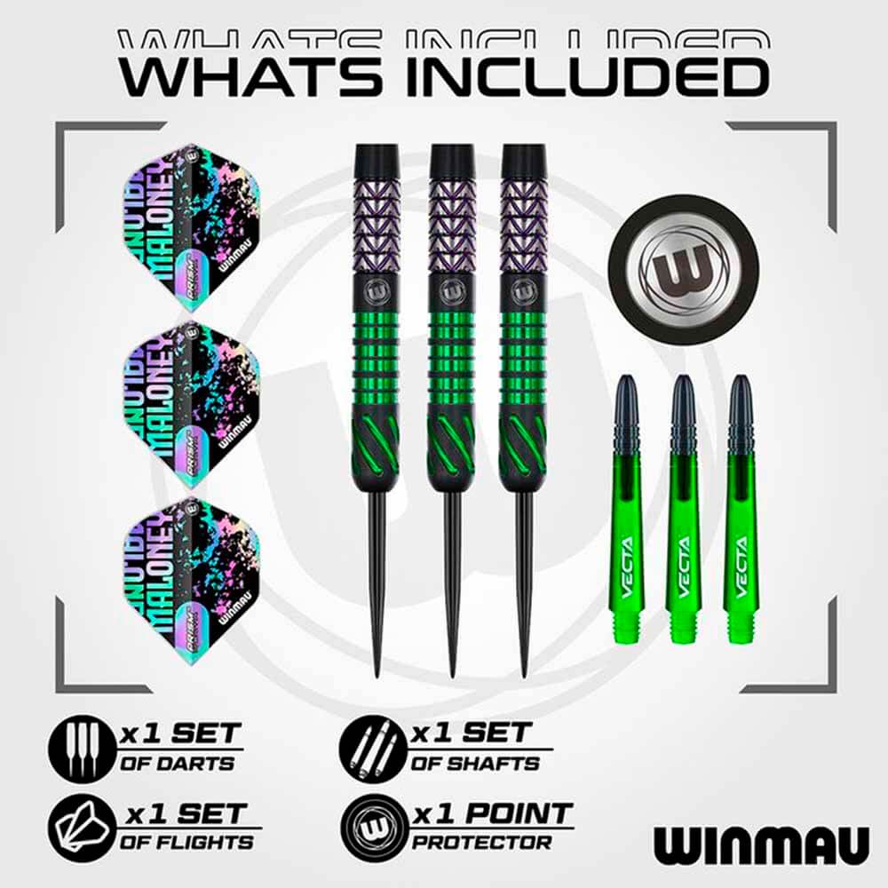 El juego de dardos Winmau Mike Maloney 24gr se compone por 1 set de 3 cuerpos, 1 sets de 3 cañas Winmau y 1 set de 3 plumas.