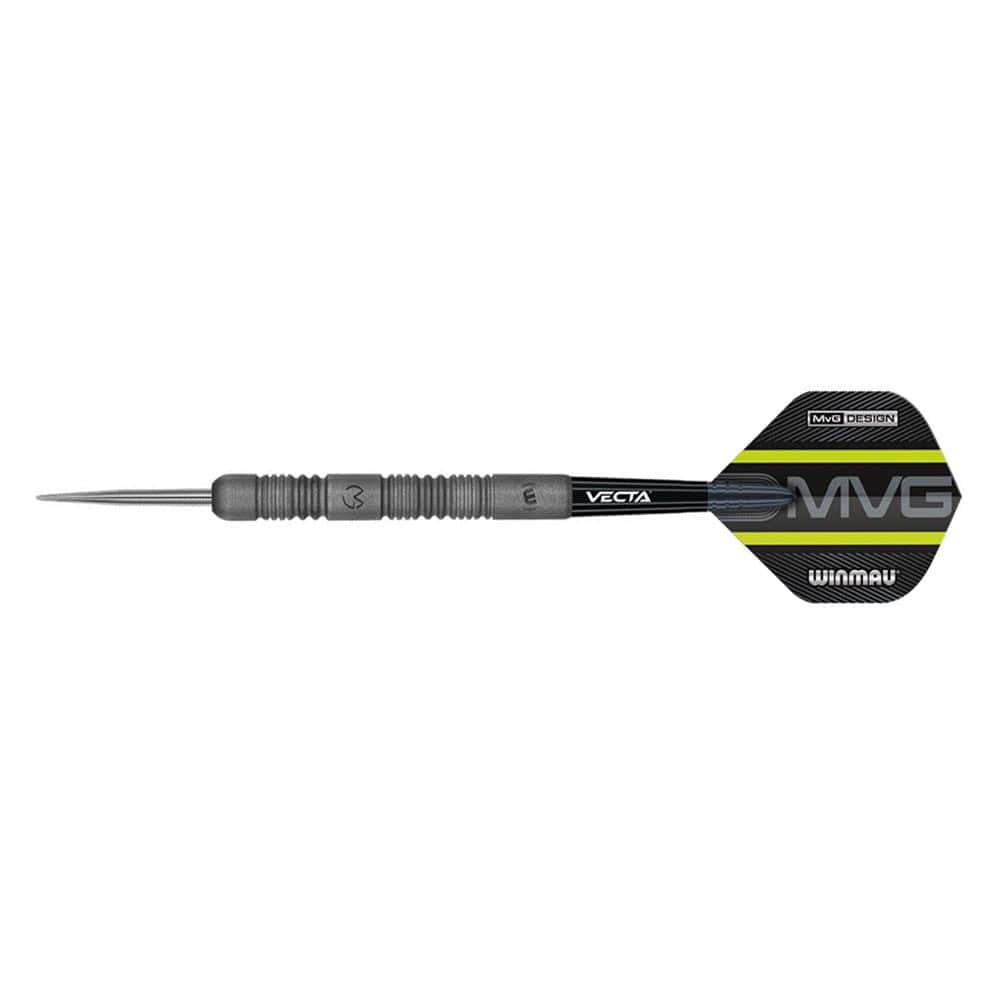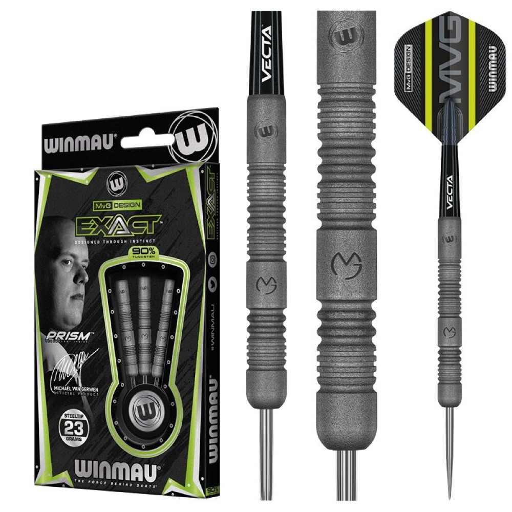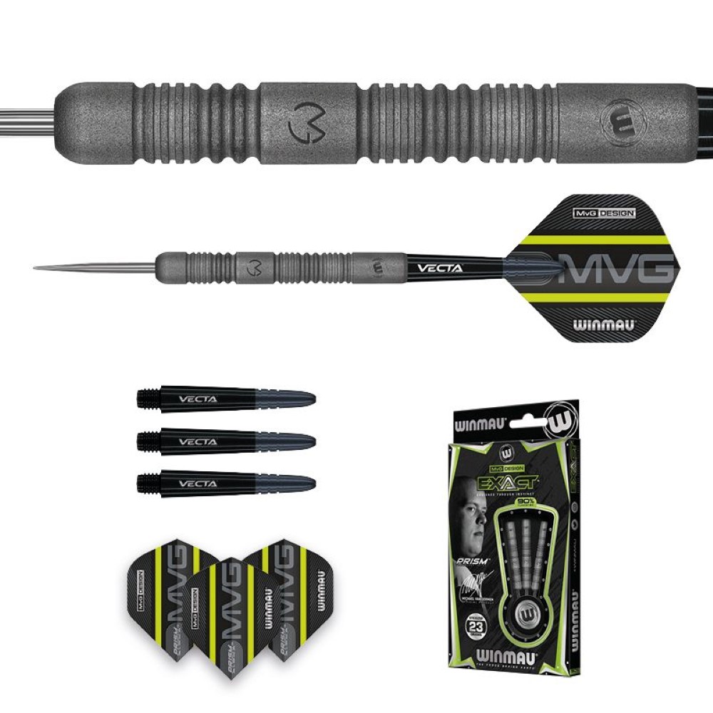 El juego de dardos Winmau MVG Exact 23gr se compone por 1 set de 3 cuerpos con punta de metal, 1 set de 3 cañas Vecta Short, 1 set de 3 plumas Prism Alpha y 1 protector de puntas de metal MVG.