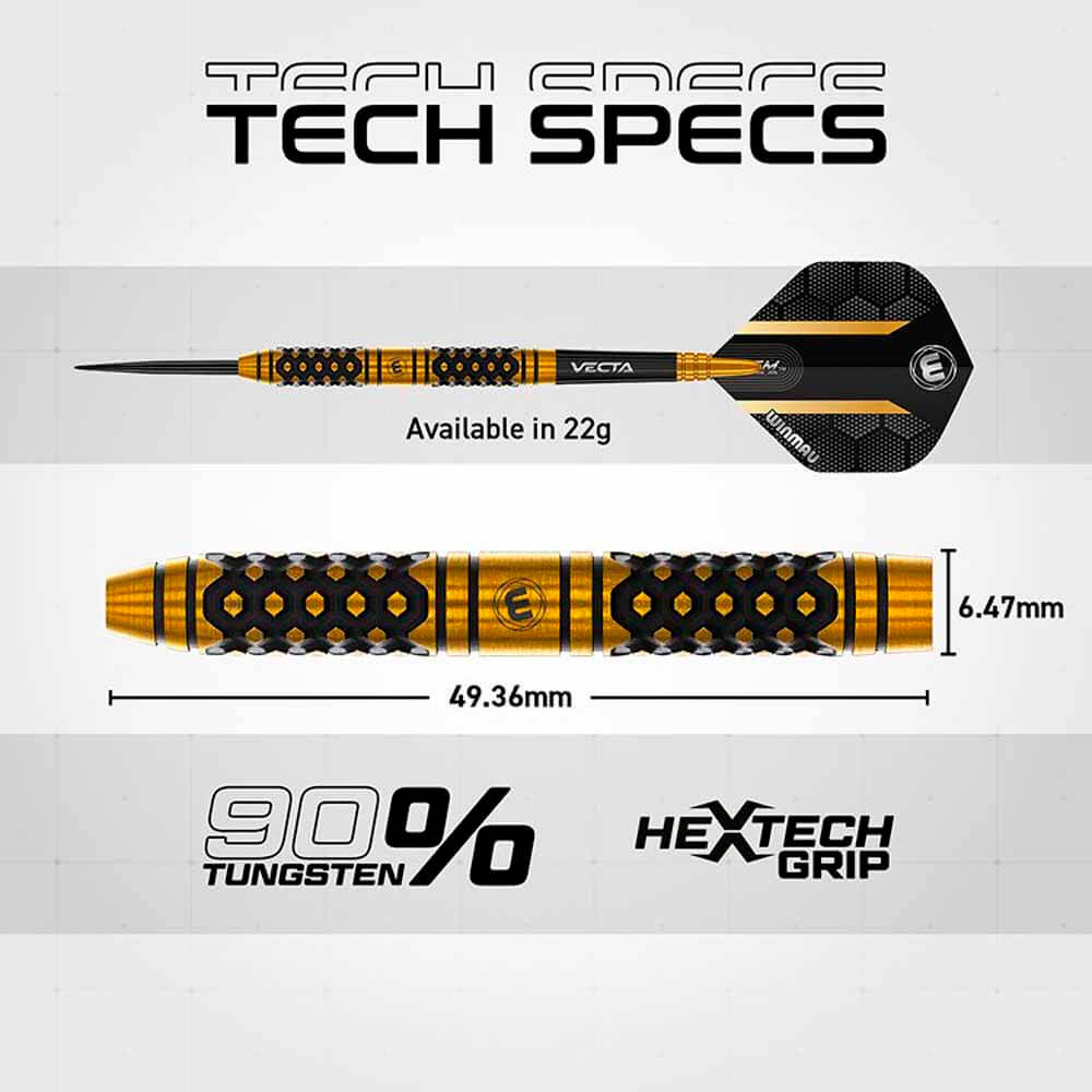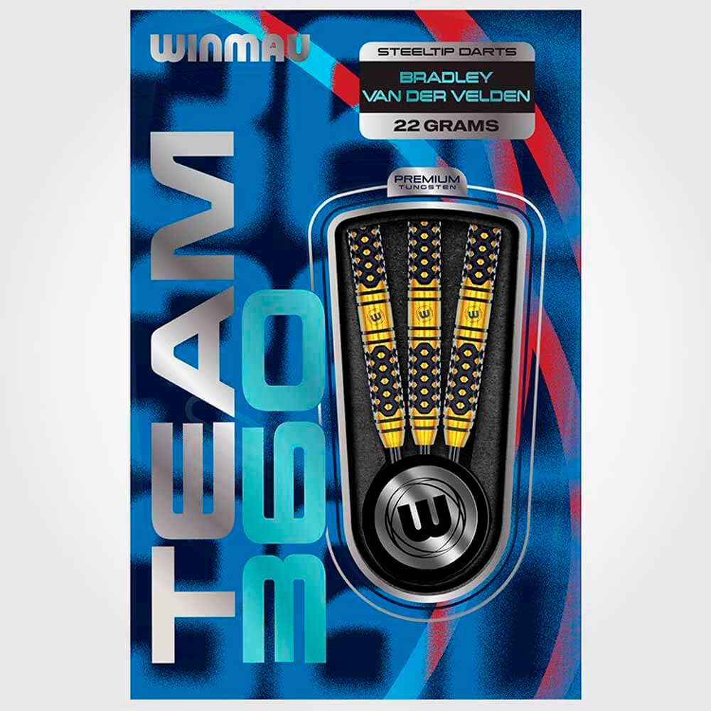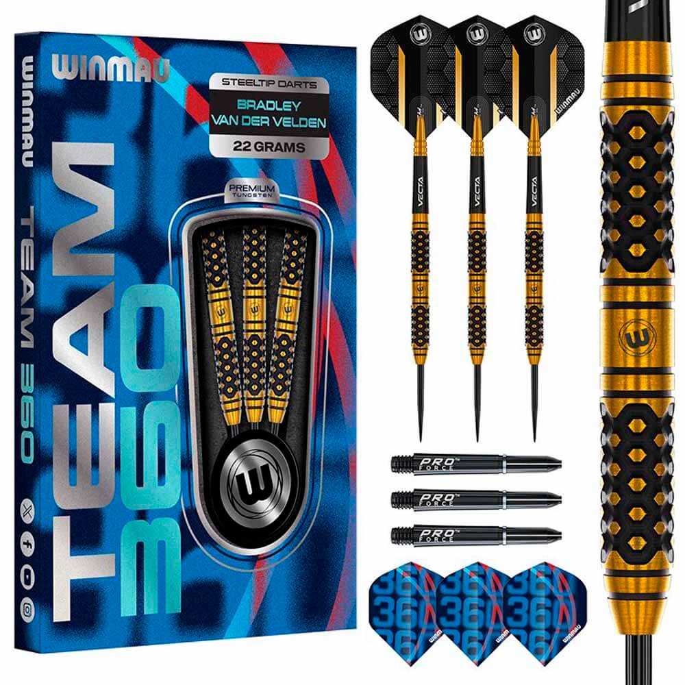 DESCRIPCIÓN:Dardos fabricados por Winmau Darts y diseñados junto a Bradley van der Velden. Fabricados con 90% tungsteno, ofrecen durabilidad y precisión. Los barrels rectos miden 50,8 mm de largo y 6,5 mm de diámetro, con un agarre mecanizado que combina confort y control. Su peso centrado asegura lanzamientos estables, mientras que el diseño negro y dorado les da un toque elegante.