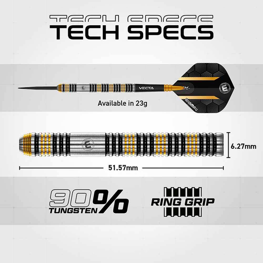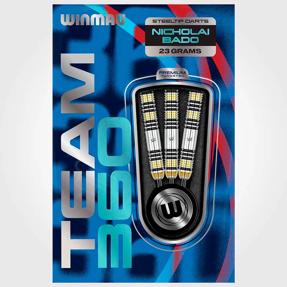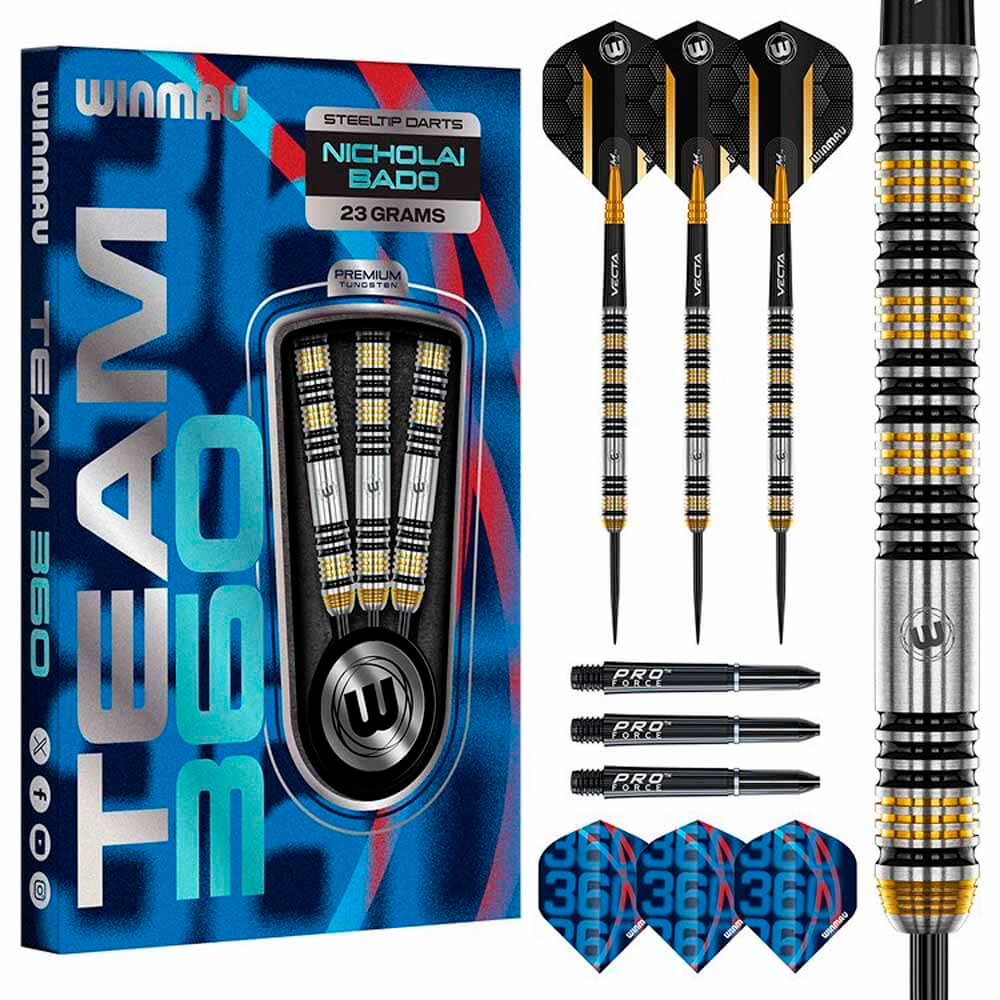 DESCRIPCIÓN:Los dardos Winmau dardos modelo Team 360 han sido diseñados por Nicholai Bado, están pensados para jugadores serios que buscan exactitud y alto rendimiento. Con un 90% de tungsteno, su cuerpo de dardos es delgado y denso, ofreciendo un control excelente en cada lanzamiento gracias a su diseño recto y agarre acanalado. Su combinación de colores negro, dorado y plateado les da un estilo elegante y profesional.