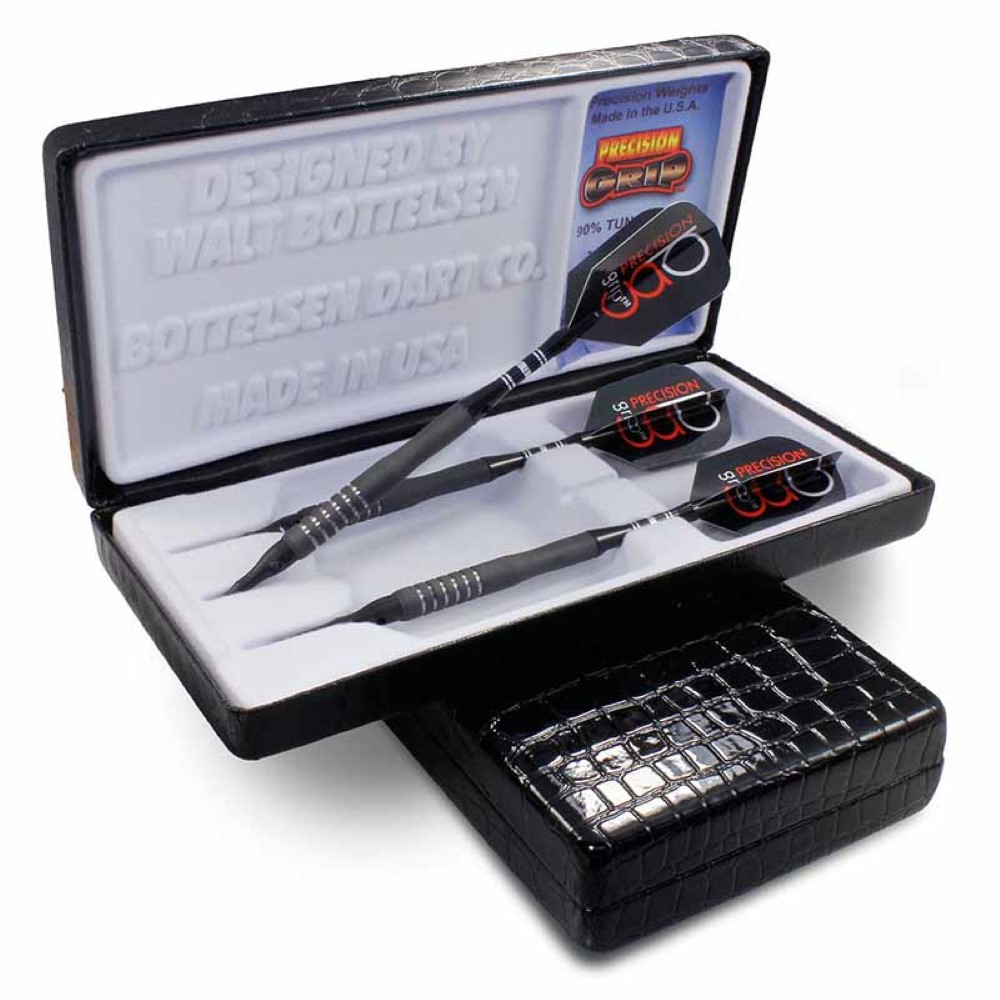 DESCRIPCIÓN:Los dardos Precision Grip son de gran calidad, fabricados en Estados Unidos por Bottelsen, dardos con un 90% de tungsteno acabado negro mate con anillos cromados.