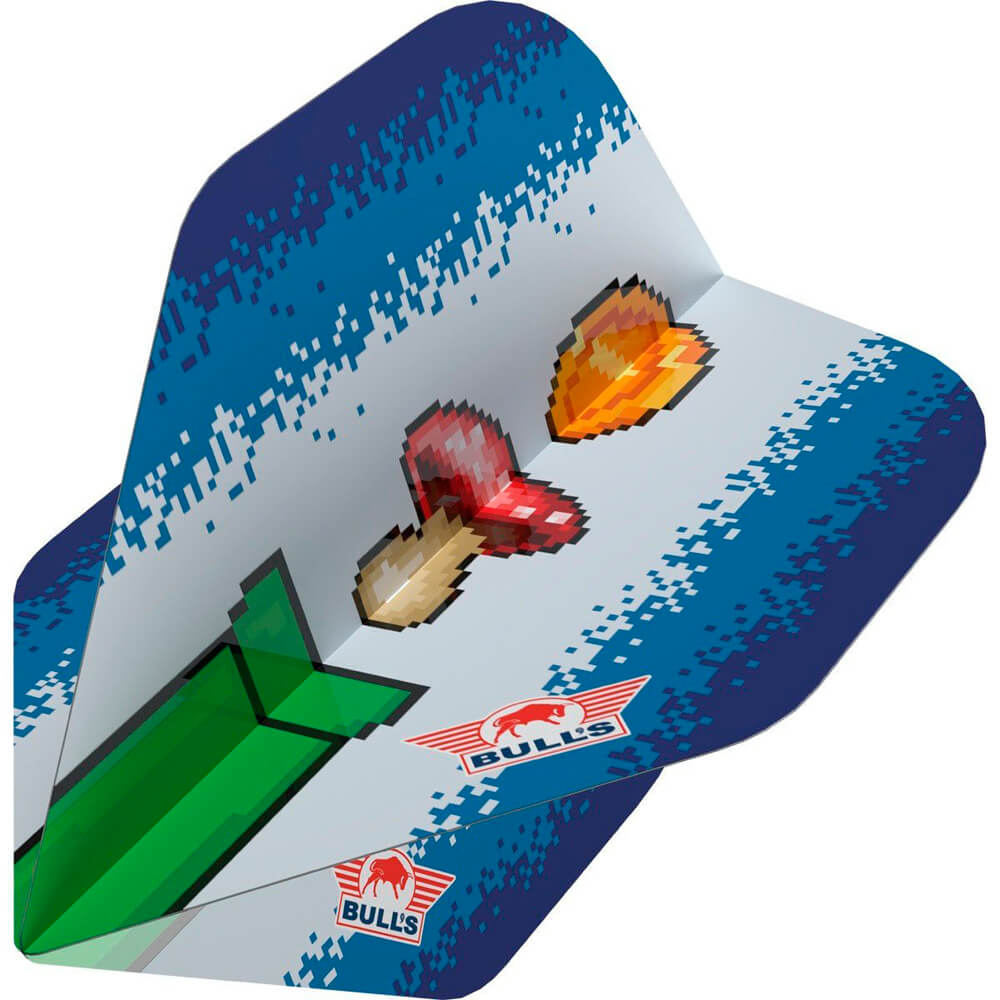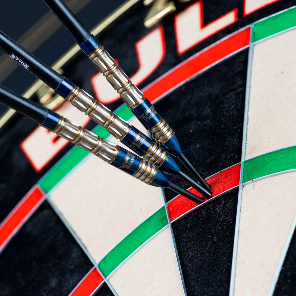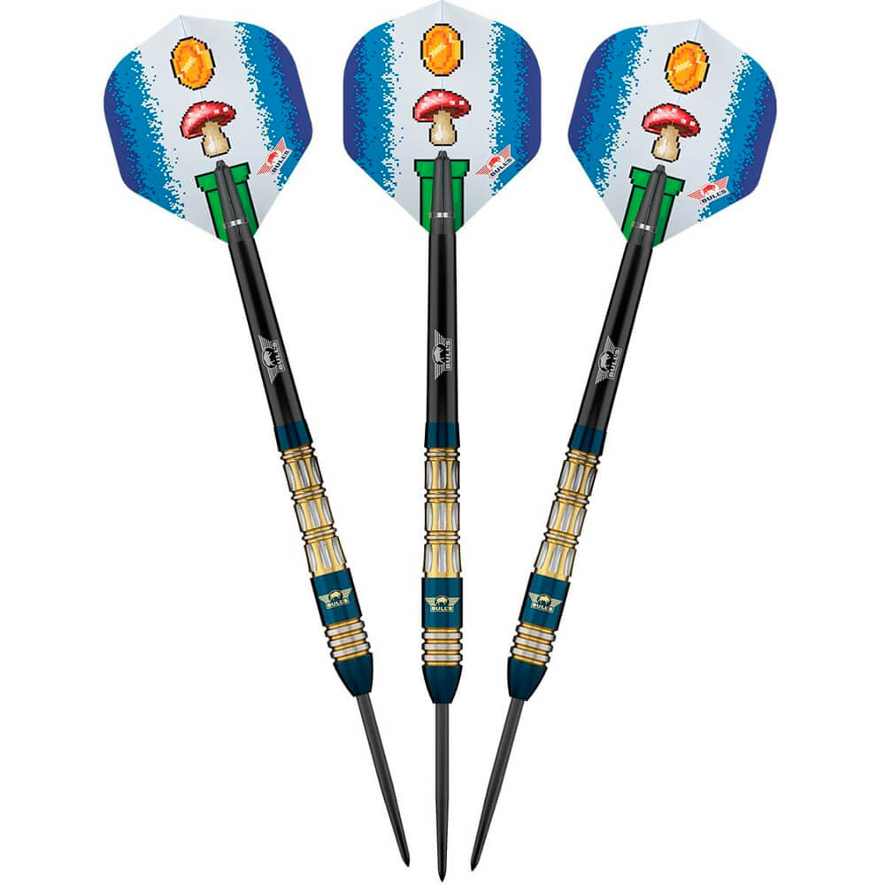 El juego de dardos se compone por 1 set de 3 cuerpos Mario Vandenbogaerde, 1 set de 3 cañas Bulls, 1 set de 3 plumas y 1 set de 3 puntas 2ba 4mm