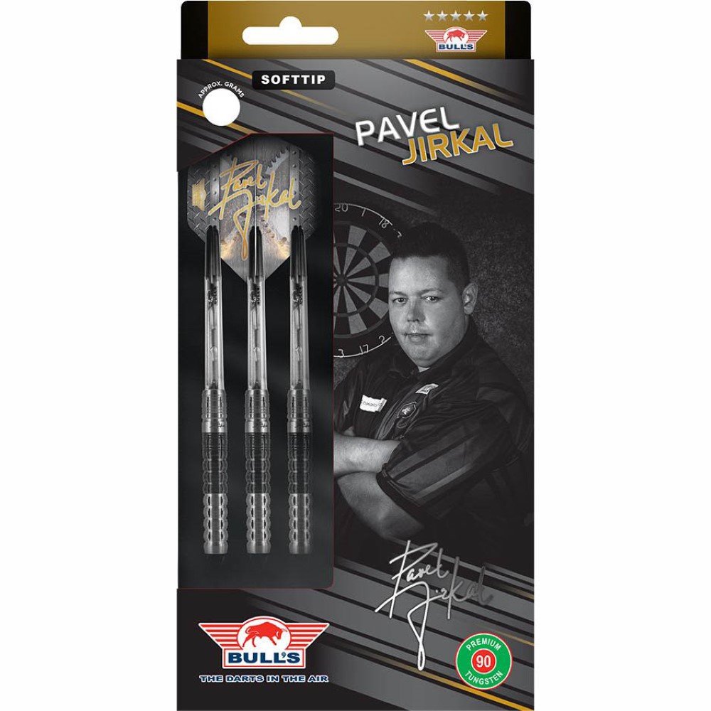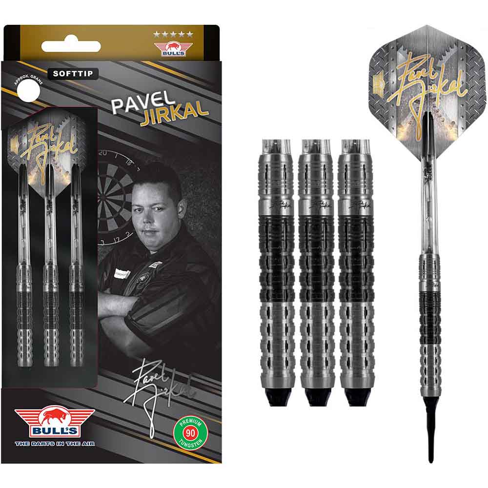 El juego de dardos se compone por 1 set de 3 cuerpos Pavel Jirkal, 1 set de 3 cañas Bulls, 1 set de 3 plumas y 1 set de 3 puntas 2ba 4mm