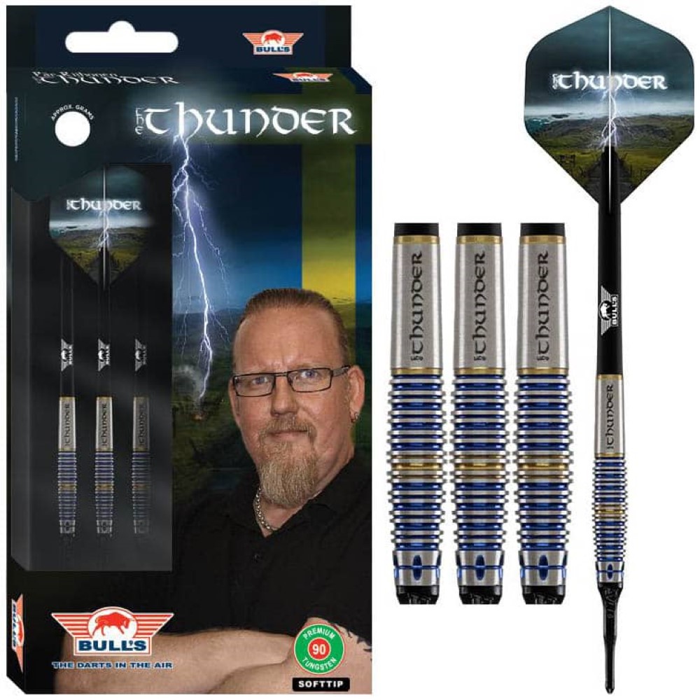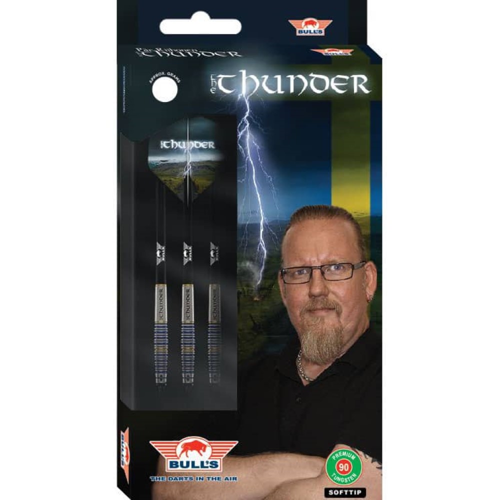 El juego de dardos se compone por 1 set de 3 cuerpos Max The Thunder , 1 set de 3 cañas Bulls, 1 set de 3 plumas y 1 set de 3 puntas 2ba 4mm