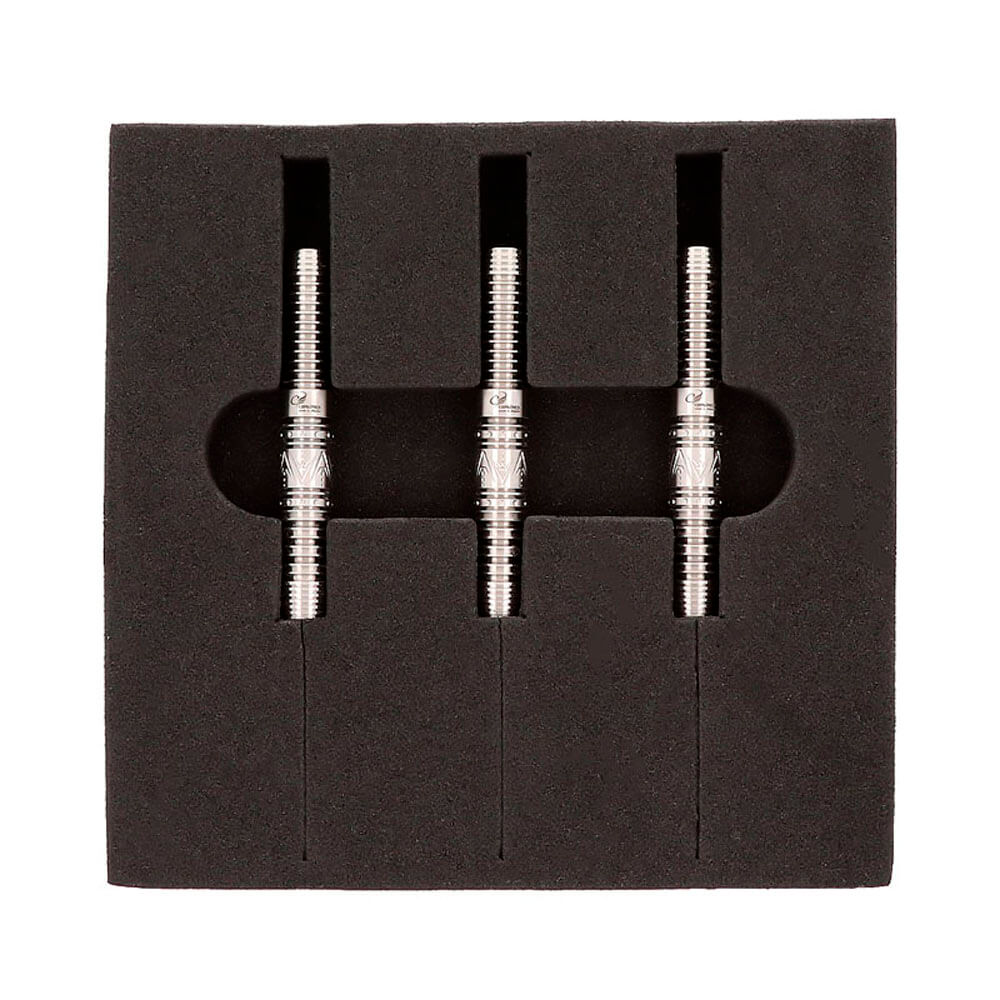 El barril está dividido visual y funcionalmente. En la zona trasera, cuenta con una combinación de cortes de tiburón (shark cuts) y cortes anulares (ring cuts). Esta configuración está pensada para jugadores que "empujan" el dardo desde atrás, proporcionando una tracción máxima sin que el dardo resbale.