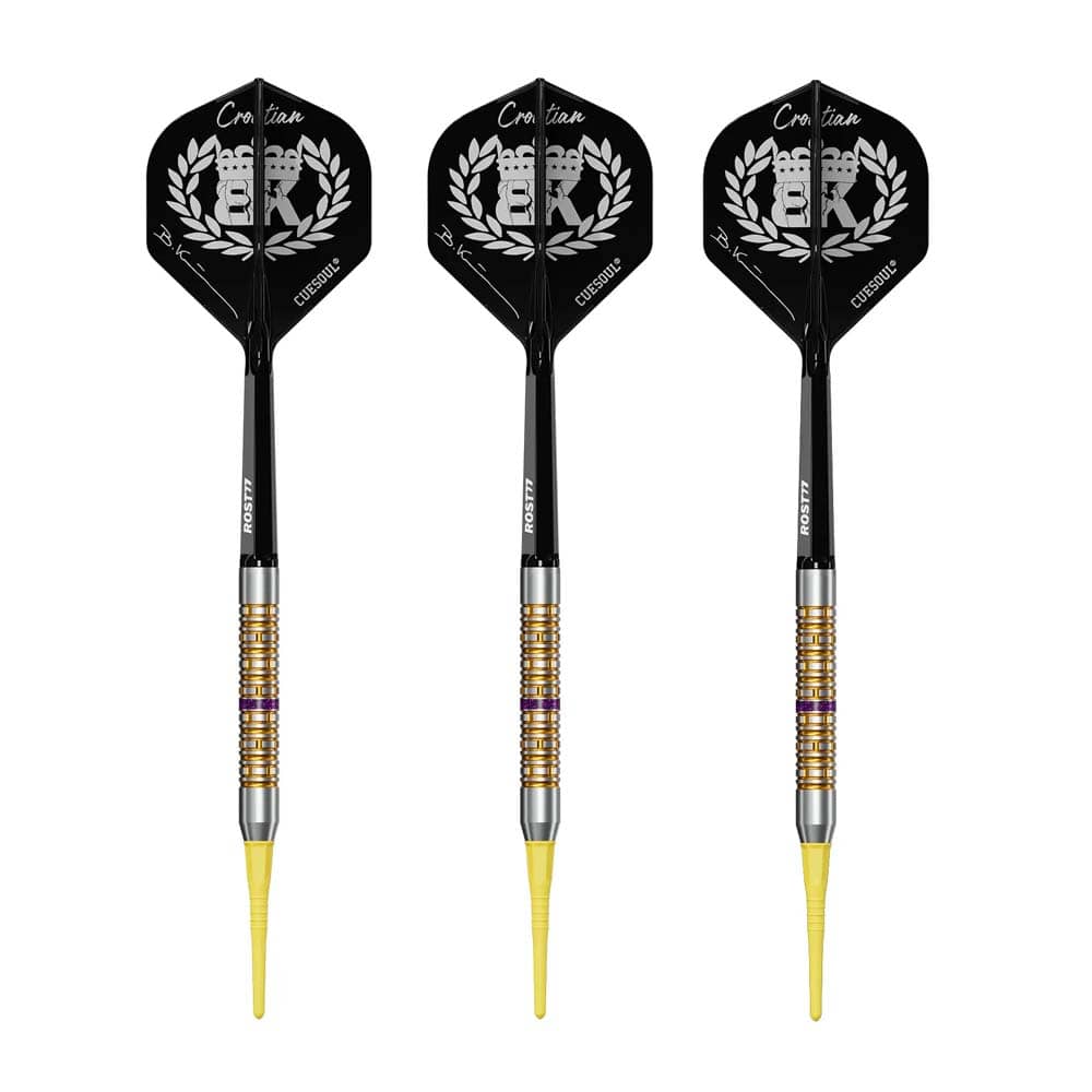 El producto se compone por 1 set de 3 cuerpos de dardos Cuesoul Boris Krcmar, 1 set de 3 plumas con caña integrada Cuesoul Rost 77, 3 puntas de acero, varias puntas de plástico, una llave para cambiar puntas OTO y 1 piedra de afilar puntas.