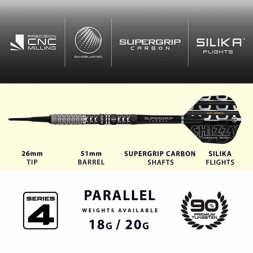 DESCRIPCIÓN:Presentamos la última evolución de la gama Harrows de Dave "Chizzy" Chisnall, 27 veces ganador del título PDC, diseñada para quienes buscan un rendimiento sin concesiones. Los dardos Serie 4 de Chizzy ofrecen el control, la sensación y la confianza necesarios para competir al máximo nivel.