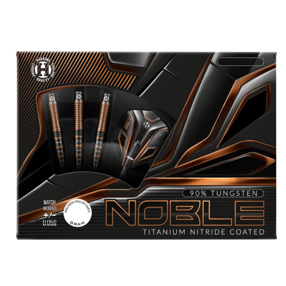 Dardos con un trabajo en su cuerpo perfecto, con varios tipos de agarre y un acabado muy ergonómico, anillos lacados en dorado y plateado , el acabado final del modelo Noble a sido con nitrito de titanio negro para realzar aún su excelente trabajo de Harrows en este modelo.