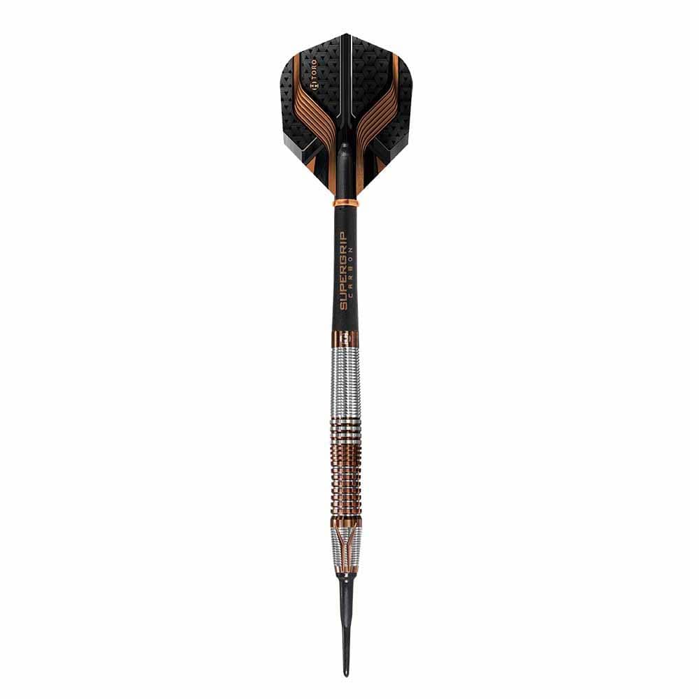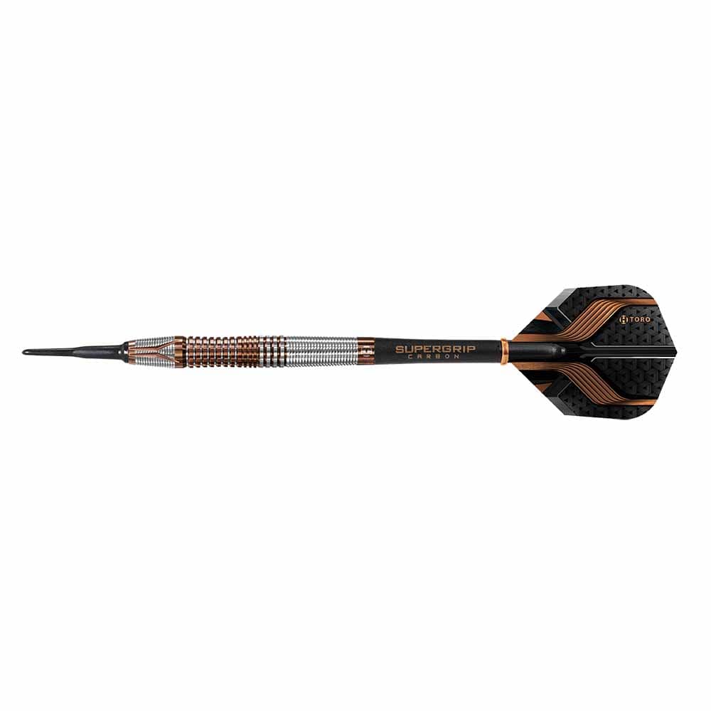 El dardos se compone por 1 set de 3 cuerpos Harrows Darts Toro, 1 set de 3 cañas Harrows SuperGrip Carbono y 1 set de 3 plumas Toro Harrows Darts.