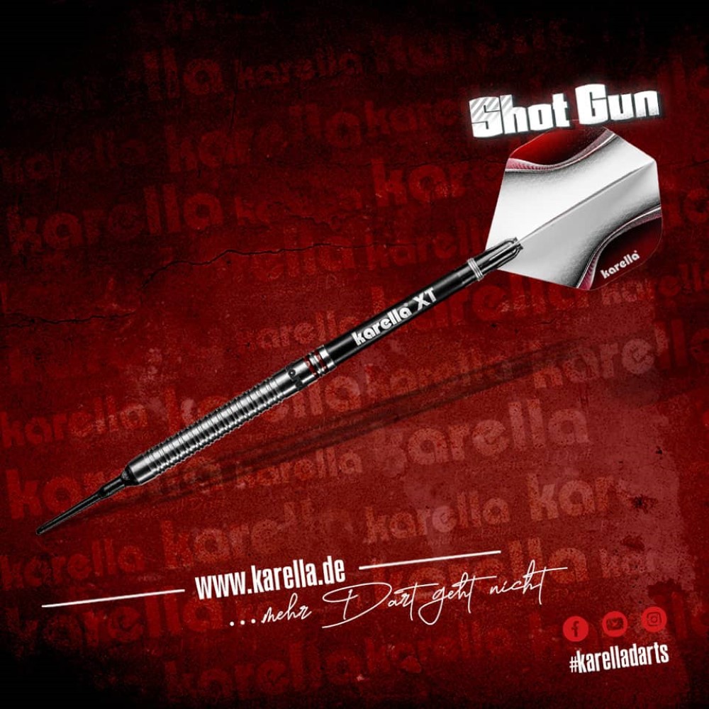 El juego de dardos se compone por 1 set de 3 cuerpos Karella Shotgun, 1 set de 3 cañas, 1 set de 3 plumas y 1 set de 3 puntas 2ba