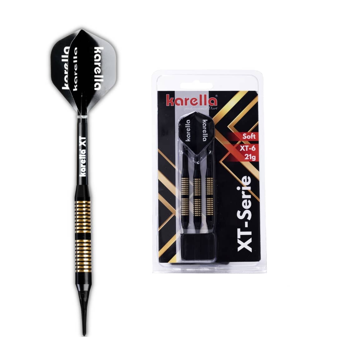 El juego de dardos se compone por 1 set de 3 cuerpos Karella XT 6, 1 set de 3 cañas, 1 set de 3 plumas y 1 set de 3 puntas 2ba
