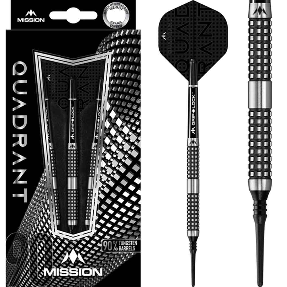 Dardos de tungsteno de punta blanda Mission Quadrant M4 - 90% tungsteno. Características: 90 % barriles de tungsteno con empuñadura cuádruple, 1 juego de plumas de misión, 1 juego de ejes de misión con anillos S-Lock, protector de puntos. Dardos Mission Quadrant - Punta blanda - M3 - Quad Grip