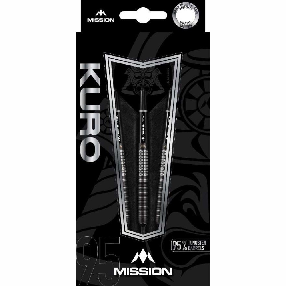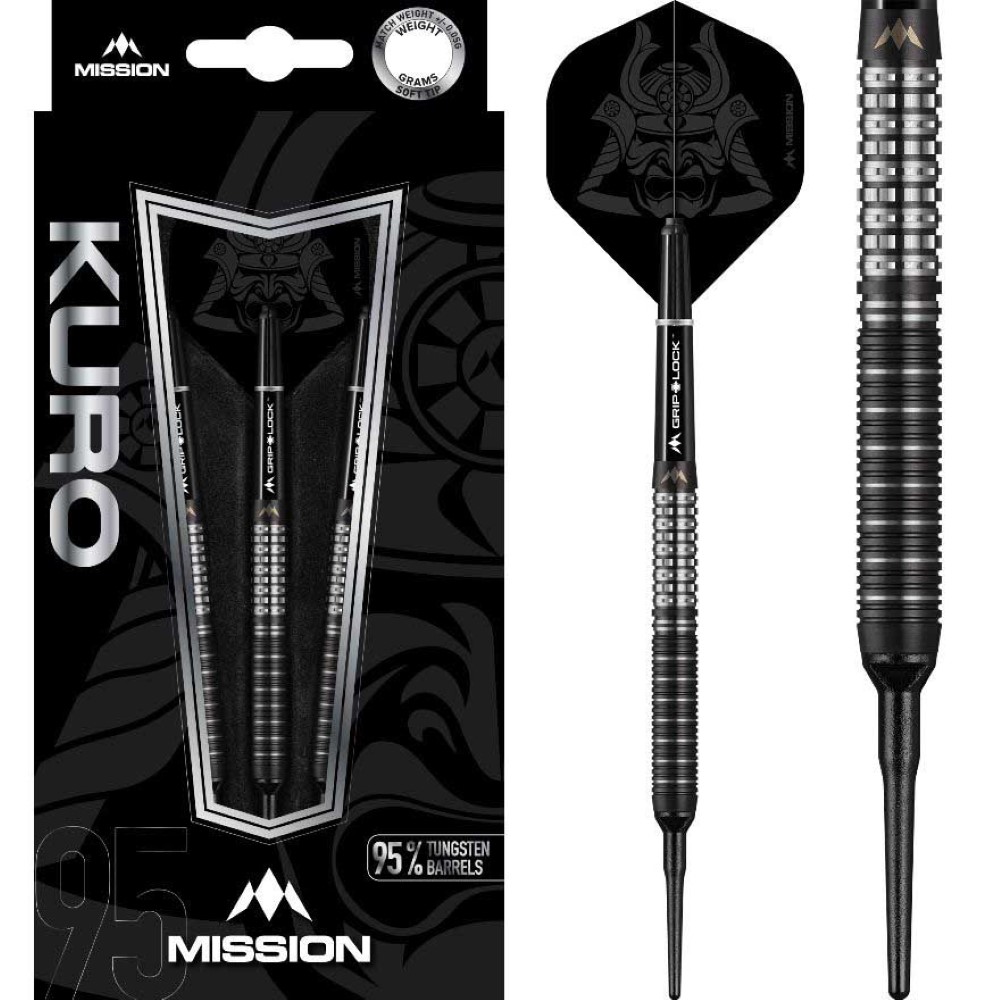 El juego de dardos se compone por 1 set de 3 cuerpos de dardos Mission Kuro 95% M1 , 1 set de 3 cañas, 1 set de 3 plumas y 1 set de 3 puntas.