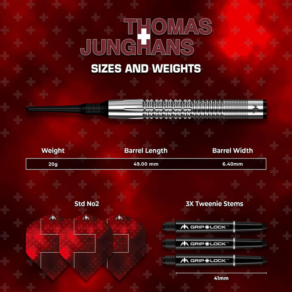DESCRIPCIÓN: El primer juego de dardos signature de Junghans para Mission está hecho de un material de tungsteno al 90%. Este dardo de barril recto tiene tres secciones con ranuras radiales que recorren casi toda la longitud del barril, incluyendo una sección de cortes fresados ??hacia la parte delantera. Una punta cónica mayormente lisa tiene una selección de cortes que conducen a una punta negra lisa. La parte trasera del barril tiene una pequeña sección lisa con el logotipo de Mission grabado con láser. Los dardos Mission de Junghans vienen completos con ejes Mission Grip Lock negros y las plumas Mission signature del jugador.
