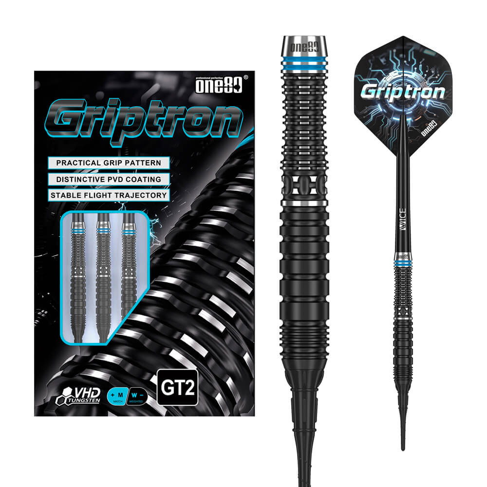 DESCRIPCIÓN:Los dardos ONE80 Griptron GT2 90% son la opción ideal para jugadores ambiciosos que valoran la calidad y la precisión. Con un 90% de tungsteno, estos dardos ofrecen máxima durabilidad y un diseño elegante y profesional. Sus anillos y fresados lacados en negro le confieren un aspecto elegante, convirtiéndolos en la mejor opción entre los dardos rectos de punta de plástico.