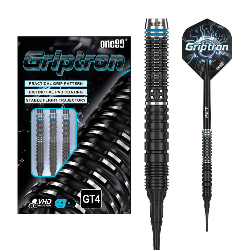 DESCRIPCIÓN:Los dardos ONE80 Griptron GT4 90% son la opción ideal para jugadores ambiciosos que valoran la calidad y la precisión. Con un 90% de tungsteno, estos dardos ofrecen máxima durabilidad y un diseño elegante y profesional. Sus anillos y fresados lacados en negro le confieren un aspecto elegante, convirtiéndolos en la mejor opción entre los dardos rectos de punta de plástico.