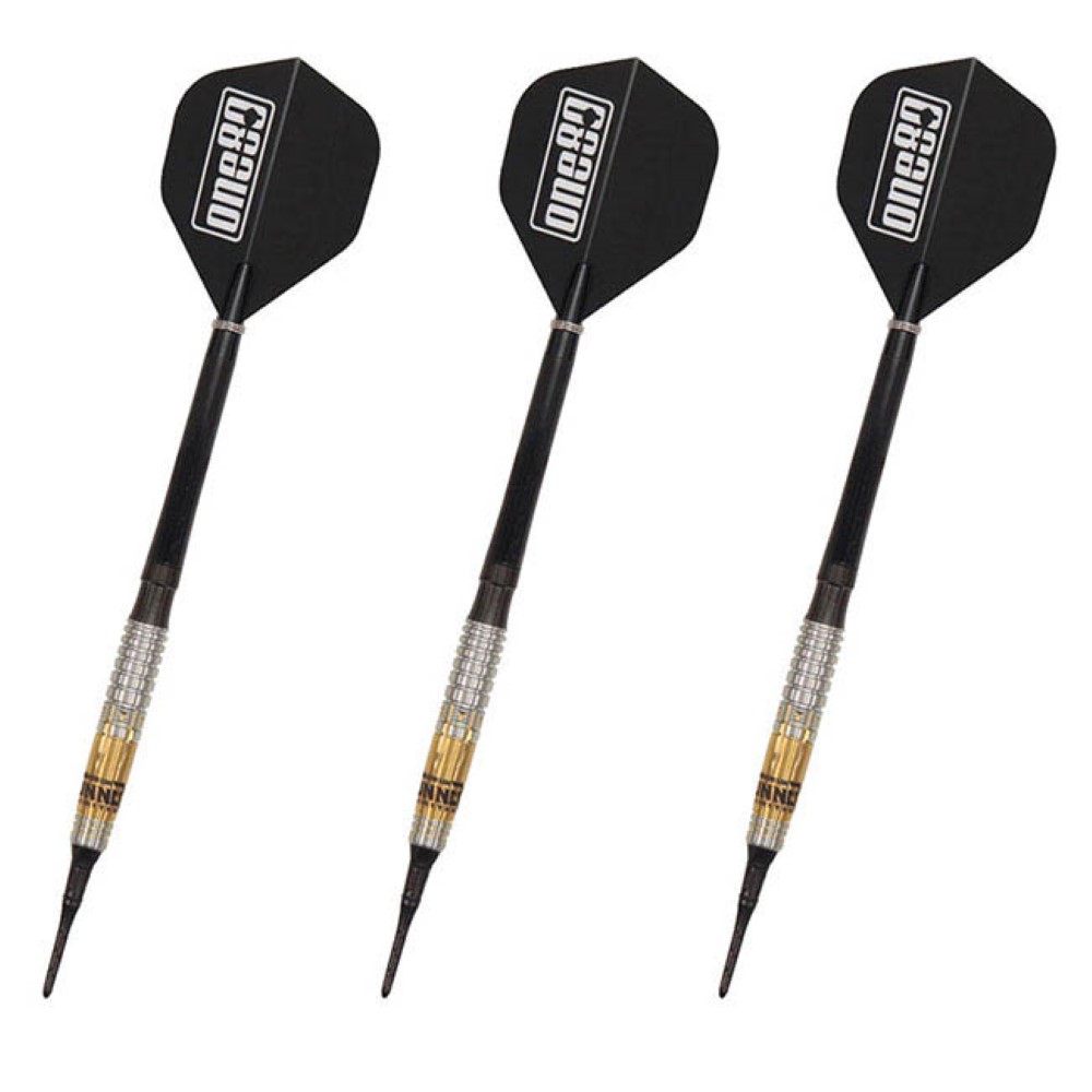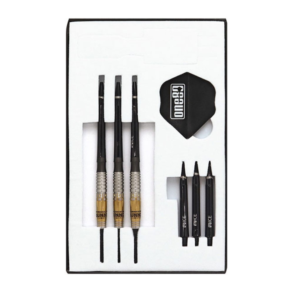 El juego de dardos One80 Gunner Ed Lourence Illagan se compone por 1 set de 3 cuerpos, 1 set de 3 cañas Vice, 1 set de 3 plumas y 1 set de 3 puntas 2ba.