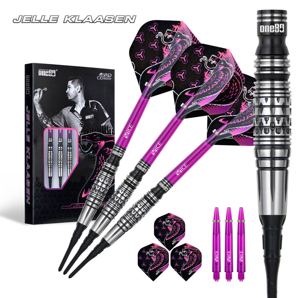 El juego de dardos Jelle Klaasen V3 se compone por 1 set de 3 cuerpos, 1 set de 3 cañas y 1 set de 3 plumas