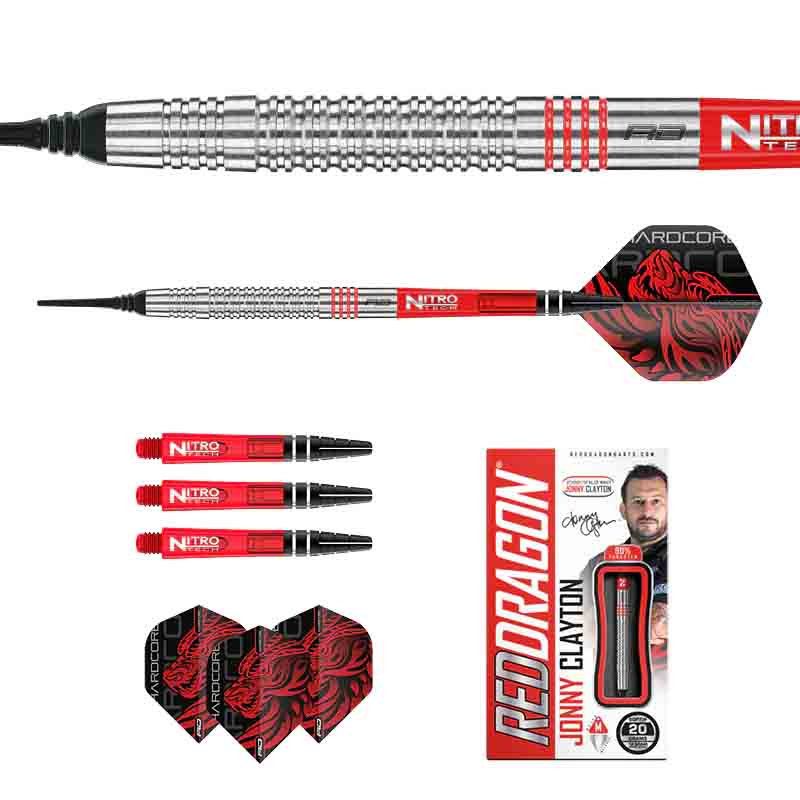 El juego de dardos e compone por 1 set de 3 cuerposJonhy Clayton Original , 1 set de 3 cañas y 1 set de 3 plumas Red Dragon.