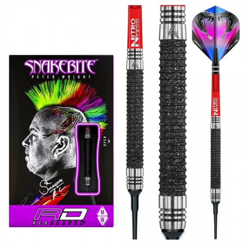 El juego de dardos e compone por 1 set de 3 cuerpos Peter Wright Snakebite Black Strike Red Dragon, 1 set de 3 cañas y 1 set de 3 plumas Red Dragon.