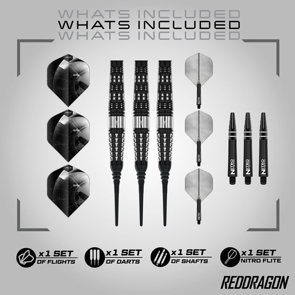 El juego de dardos se compone por 1 set de 3 cuerpos Recon Parallel con punta de plástico, 1 set de 3 cañas Red Dragon y 2 set de 3 plumas, Red Dragon Hardcore y Nitro elite.