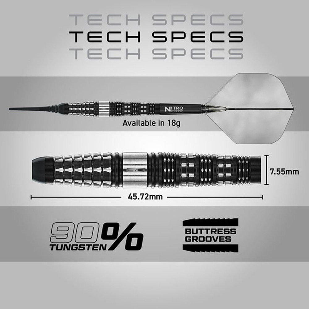 DESCRIPCIÓN:Los dardos Red Dragon Recon Torpedo Soft Tip de 20g ofrecen un rendimiento de alto nivel gracias a su fabricación en 90% de tungsteno de gran densidad. Su barril con forma de torpedo, de 45.72 mm de longitud y un diámetro máximo de 7.55 mm, proporciona una ergonomía excepcional y una sujeción firme que favorece la estabilidad en el lanzamiento. Con un equilibrio de peso centrado y un sistema de agarre avanzado que combina texturas anilladas y patrones especiales por toda la superficie, estos dardos garantizan un control clínico y una suelta consistente. Presentados con un diseño robusto en negro y plata, este set incluye el sistema Nitro Integrated Flight, asegurando una aerodinámica superior y una durabilidad profesional para el jugador de dardo electrónico más exigente.