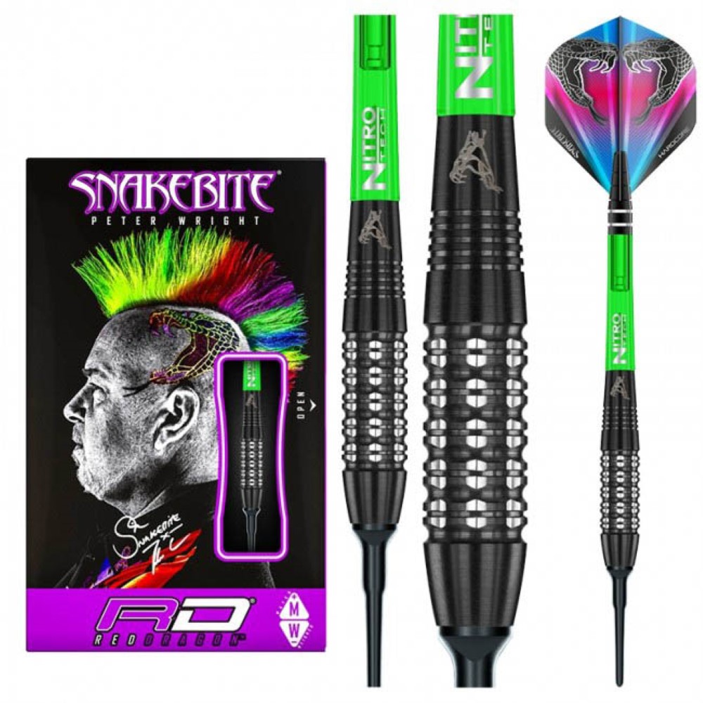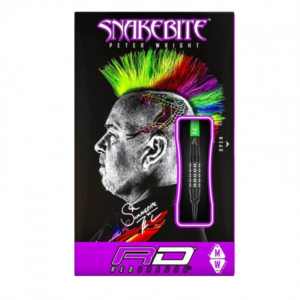 El juego de dardos e compone por 1 set de 3 cuerpos Peter Wright Snakebite Black Strike Red Dragon, 1 set de 3 cañas y 1 set de 3 plumas Red Dragon.
