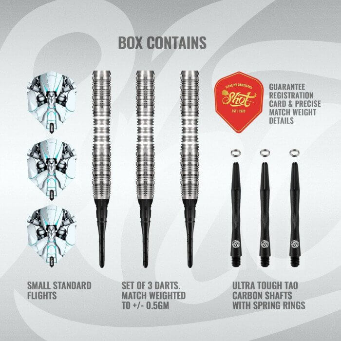 El juego de dardos Shot AI Scorpula 90% 20g se compone por 1 set de 3 cuerpos, 1 set de 3 cañas , 1 set de 3 plumas y 3 puntas de plástico rosca 2ba 4mm.