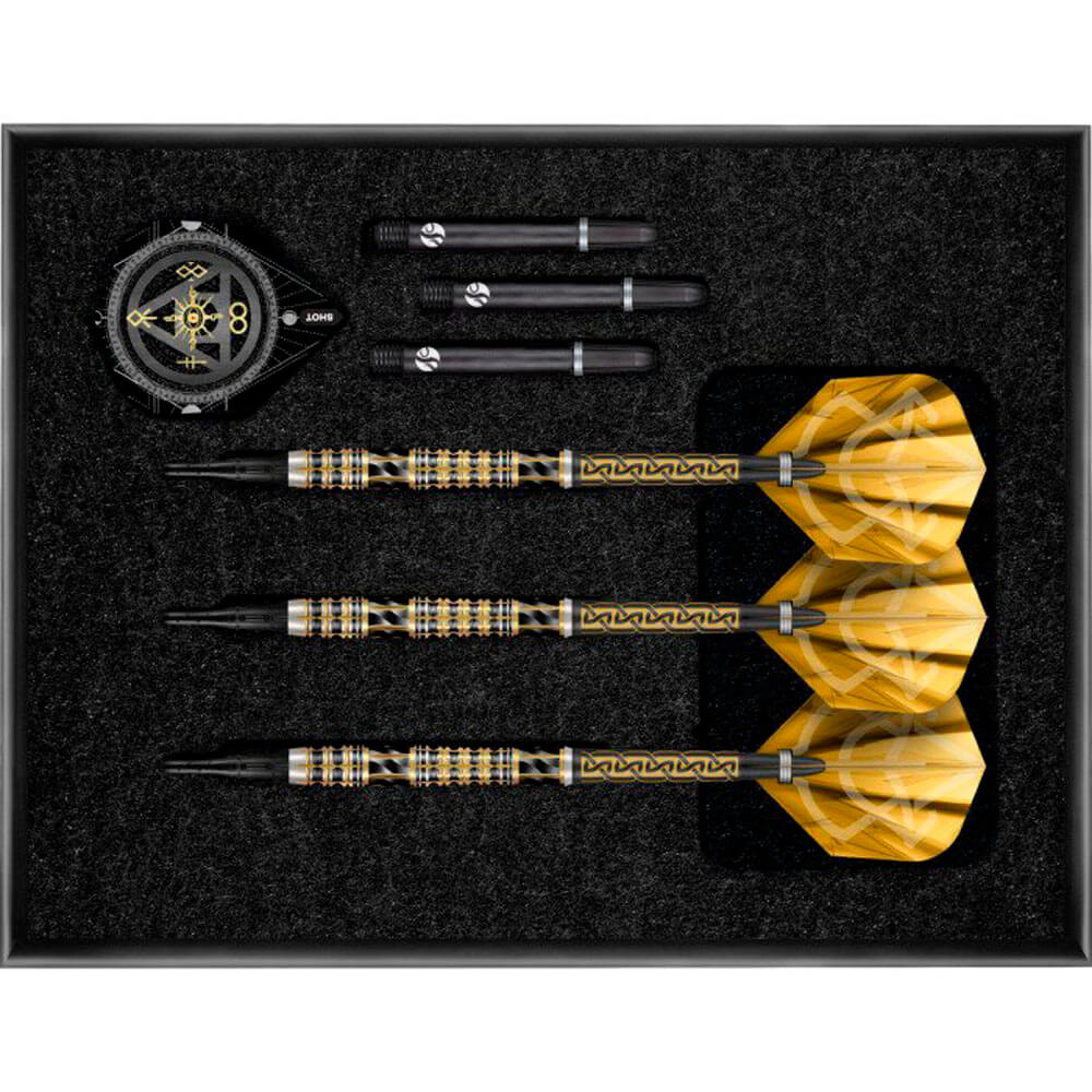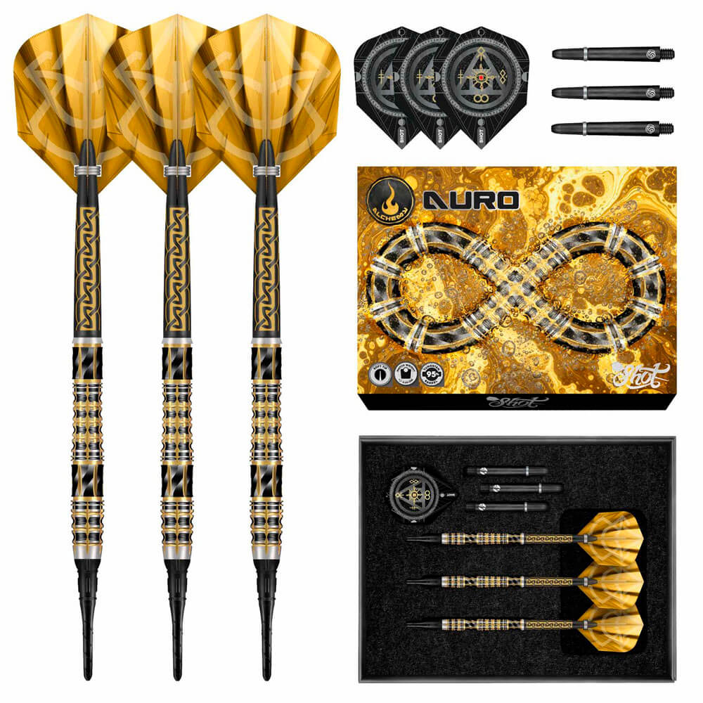 El dardos se compone por 1 ser de 3 cuerpos Shot Alchemy Auro 20gr 90%, 1 ser de 3 cañas, 1 set de 3 plumas y 1 set de 3 puntas 2ba