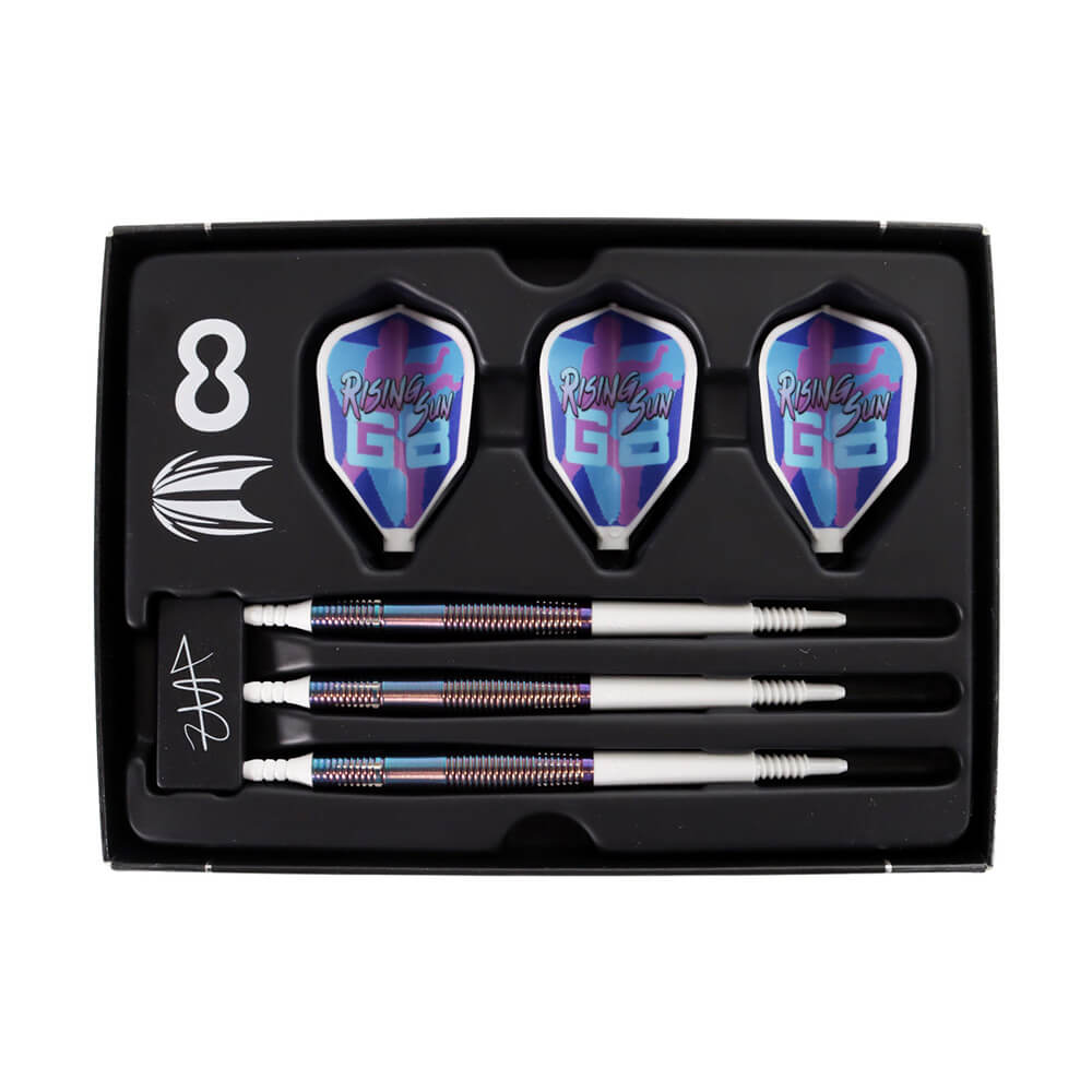 El juego de dardos se compone por 1 set de 3 cuerpos Haruki Muramatsu G8 Rising Sun Lite , 1 set de 3 cañas modelo Gen 8 , 1 set de 3 plumas modelo Gen 8.